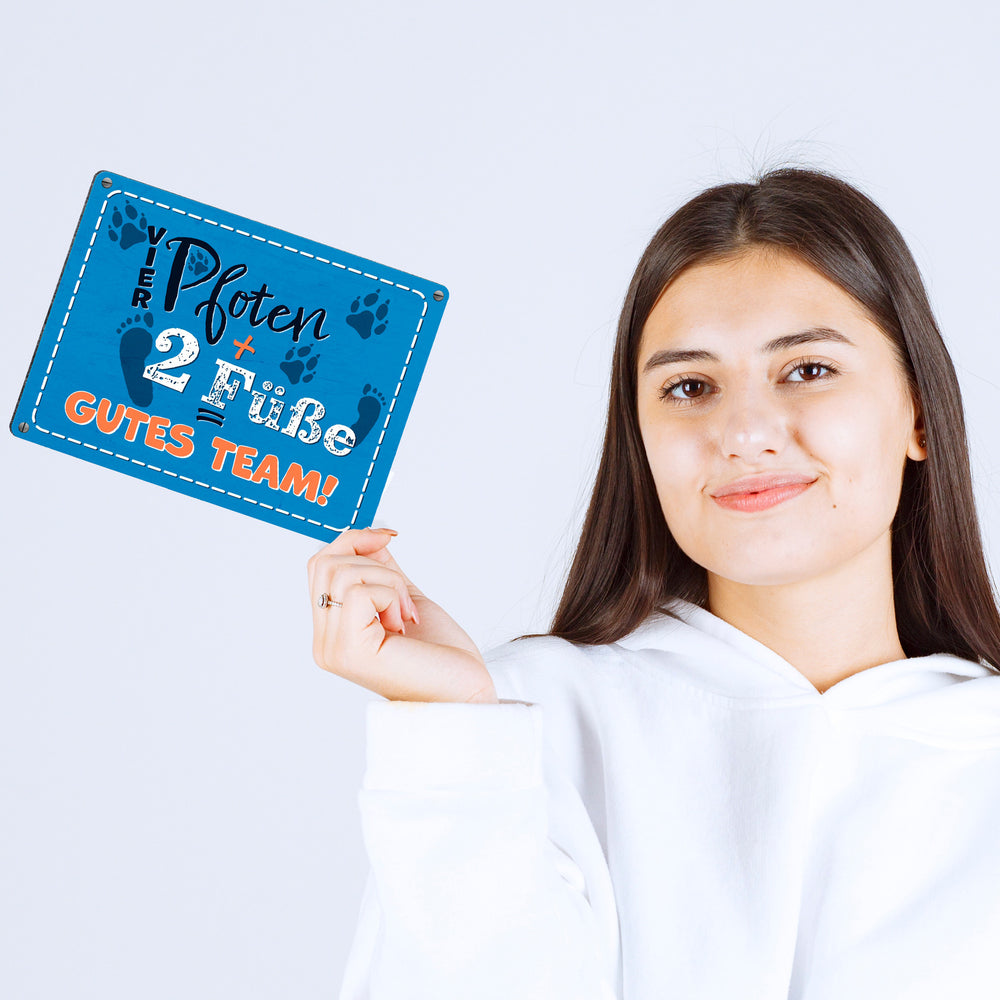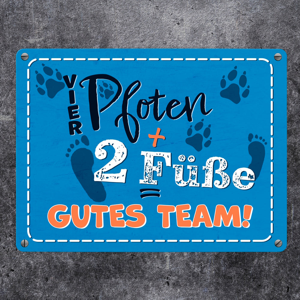 • 1x Vier Pfoten + Zwei Füße = Gutes Team Hunde Metallschild in der gewählten Größe