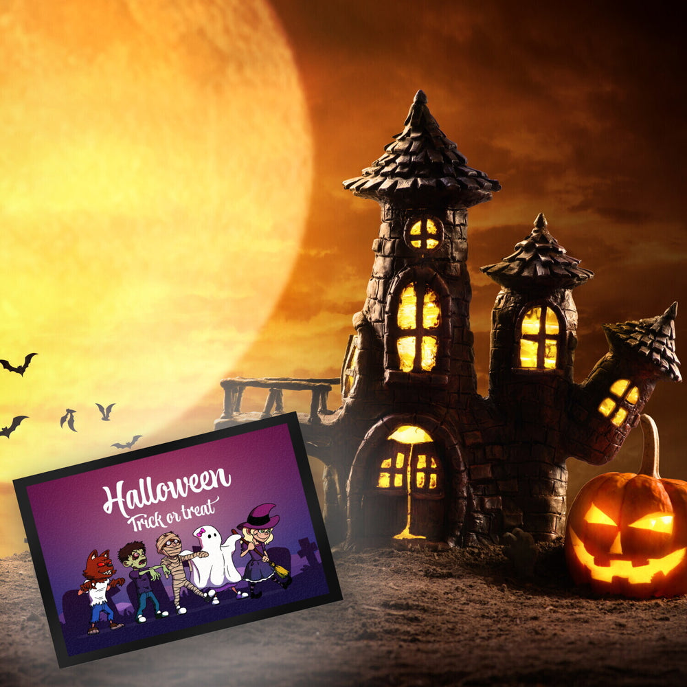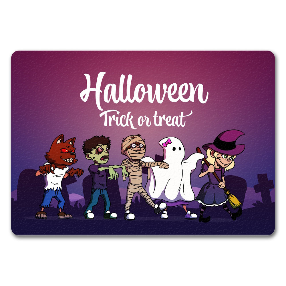- Die Nacht zu Halloween ist nicht nur die gruseligste Nacht des Jahres, sondern auch die Nacht, wo kleine Monster umher gehen und Süßigkeiten sammeln. Begrüße sie doch mit dieser Fußmatte mit den Worten Trick or Treat auf der Türschwelle.