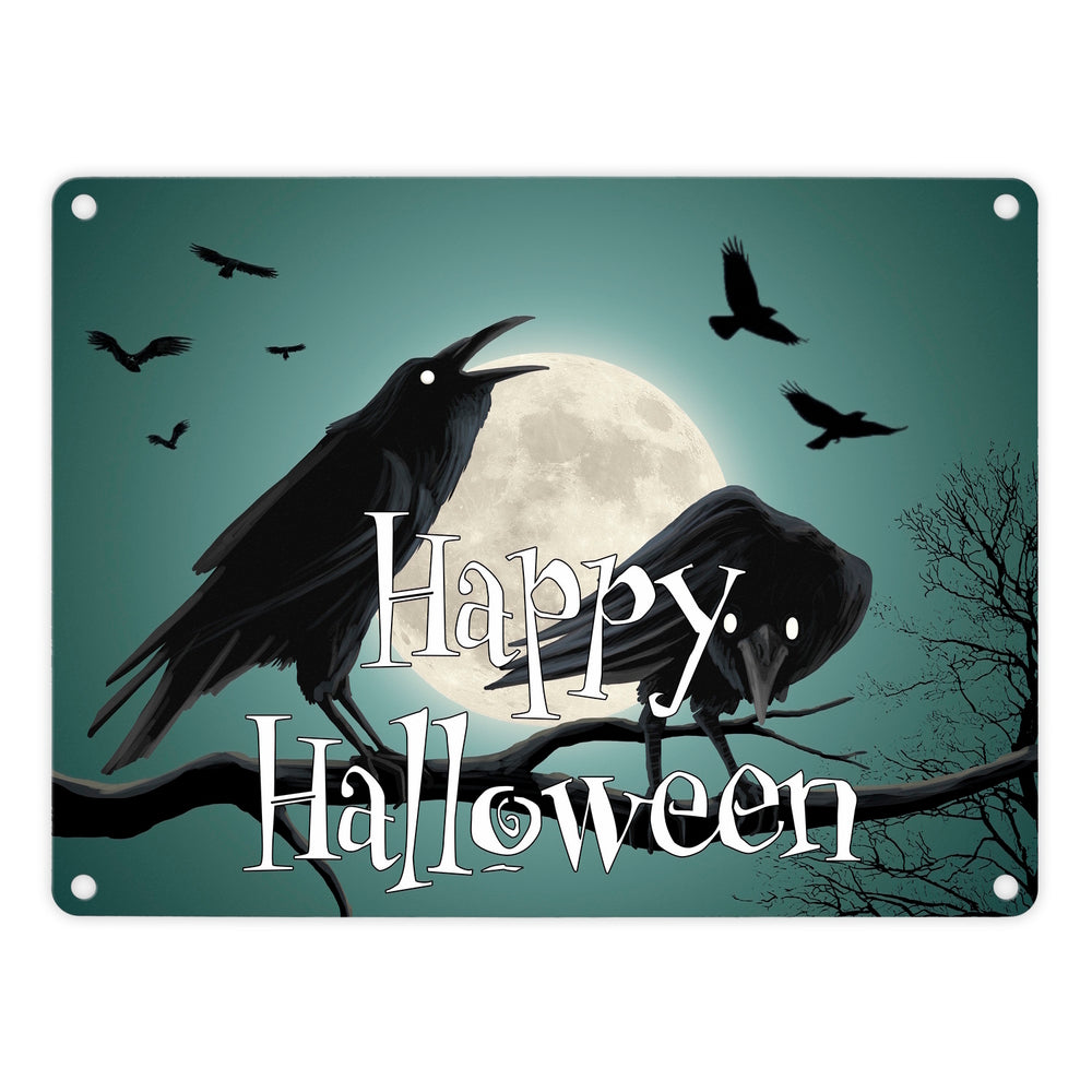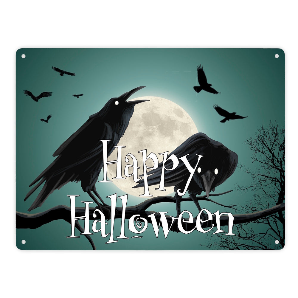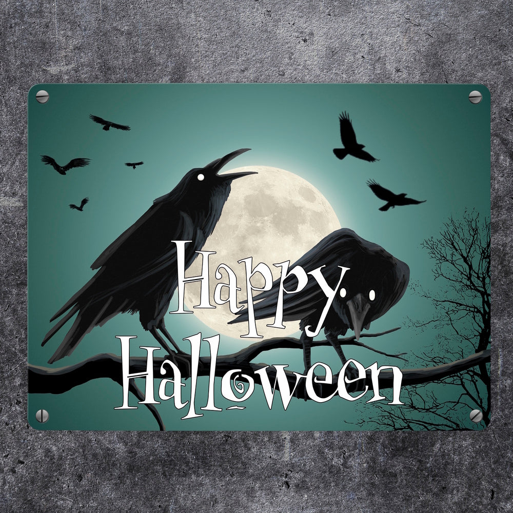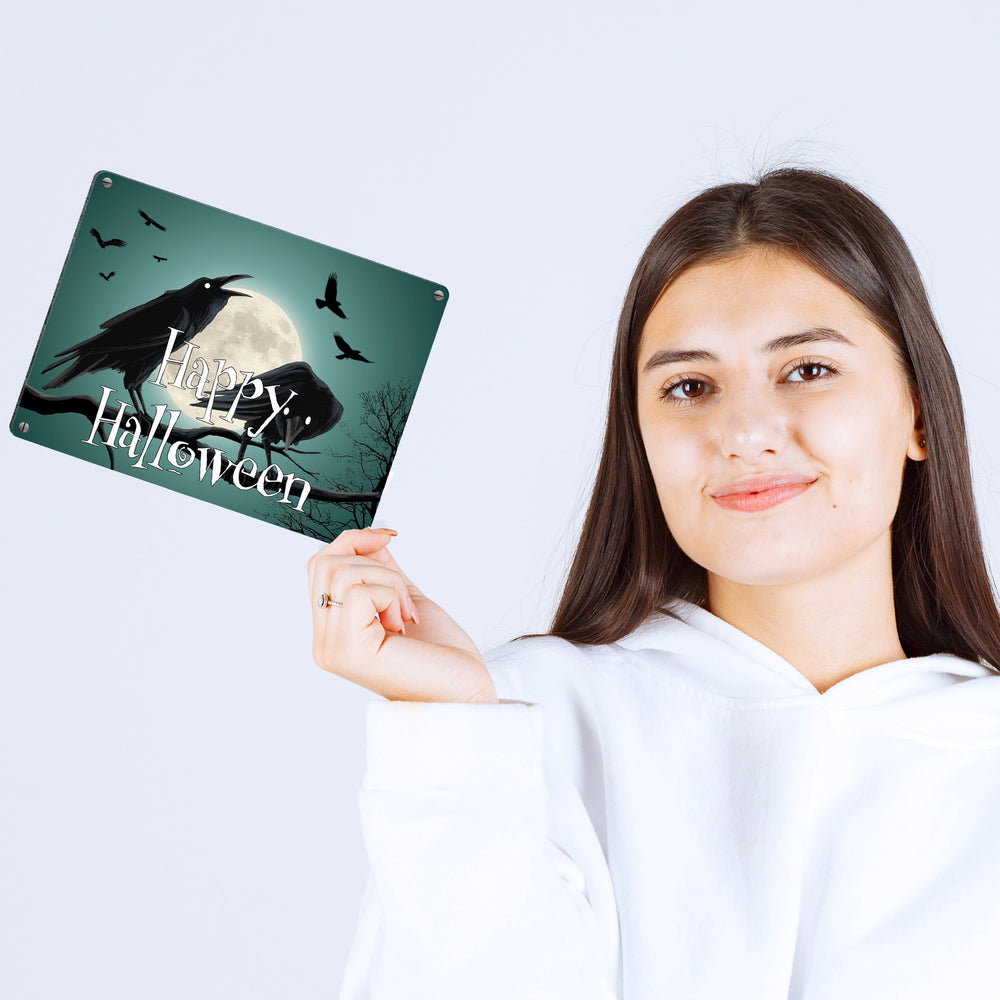 - 1x Metallschild mit gruseligem Raben Motiv und Schriftzug - Happy Halloween in der gewählten Größe