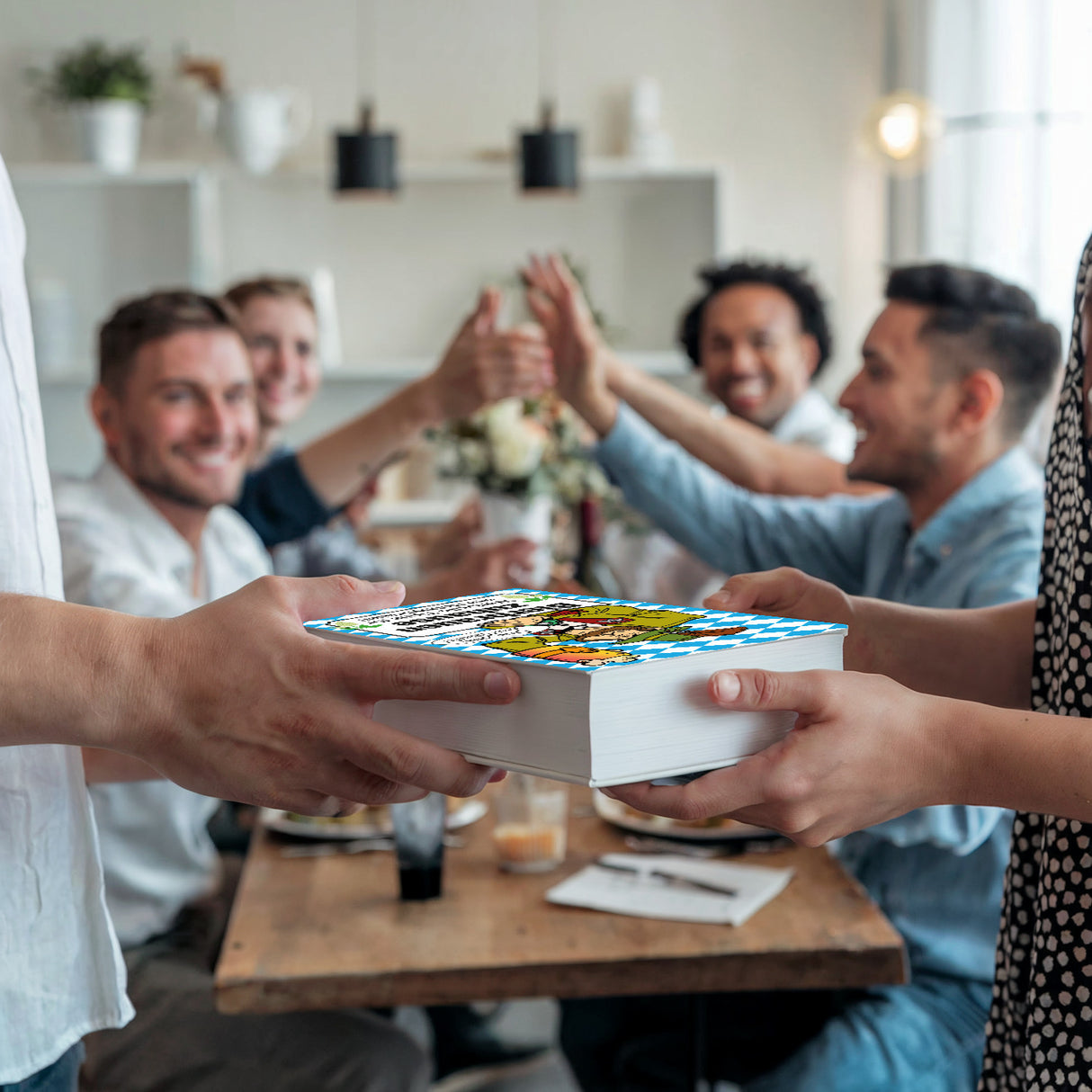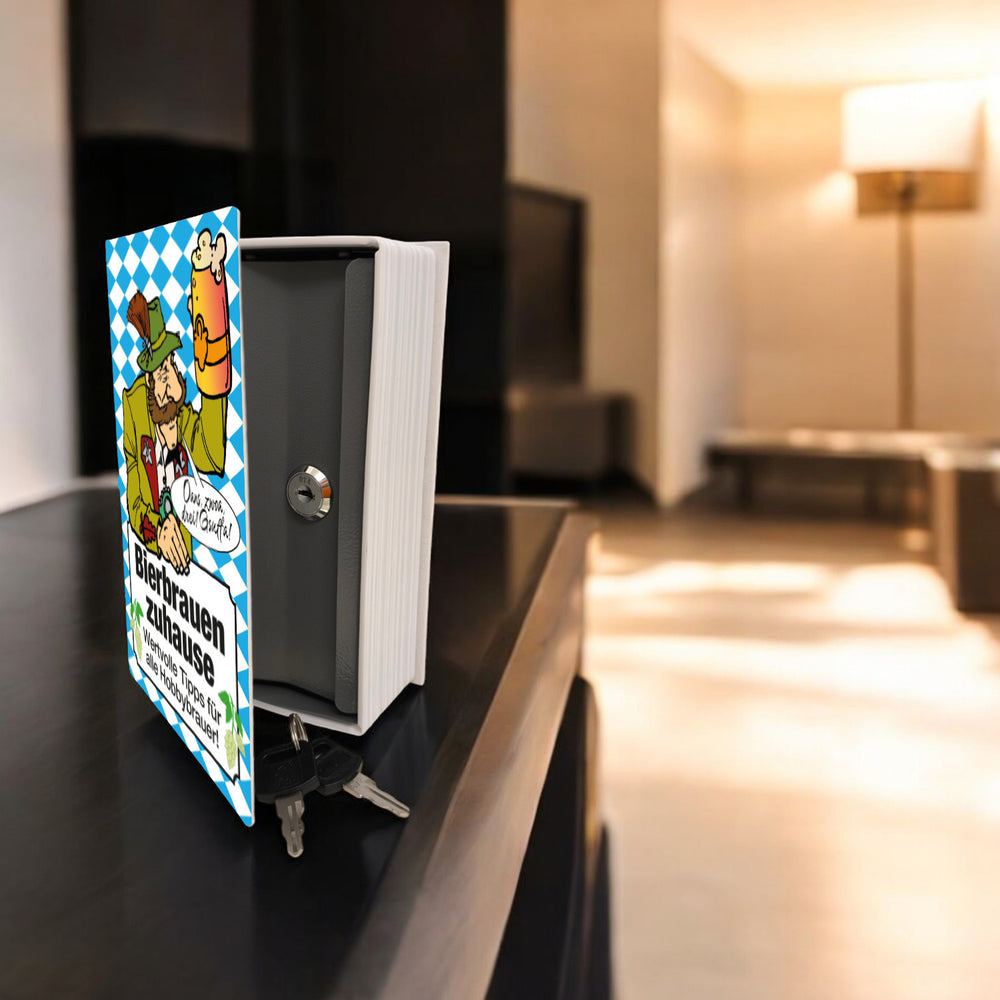 - Dieses Booksafe zeigt einen lustigen älteren Herrn mit Schnurrbart in alpenländischer Tracht. Er hält stolz einen Bierkrug mit schäumender Krone. Der Hintergrund ist in klassischen blau-weißen Rauten gehalten. Der witzige Spruch "Oans, zwoa, drei, gsuffa! Bierbrauen zuhause" rundet das Motiv perfekt ab.