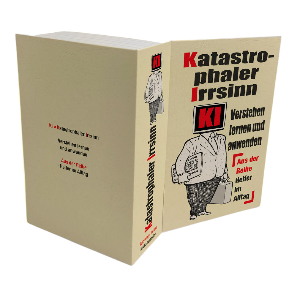 • Das Booksafe präsentiert ein humorvolles Comic-Motiv eines Mannes mit Bildschirmkopf, begleitet vom Spruch: "Katastrophaler Irrsinn. KI verstehen lernen und anwenden." Die lustige Grafik zielt darauf ab, Technikfans zum Schmunzeln zu bringen und ist Teil der originellen Reihe "Helfer im Alltag".