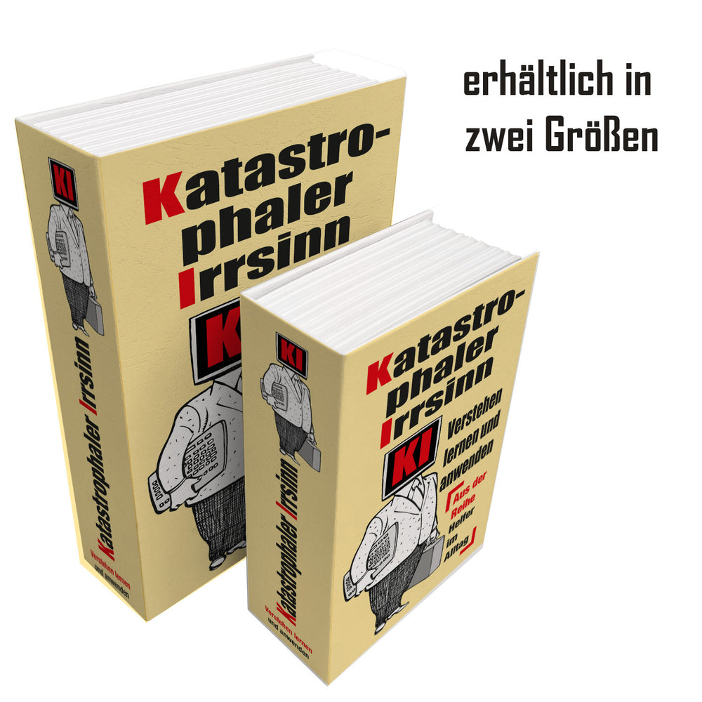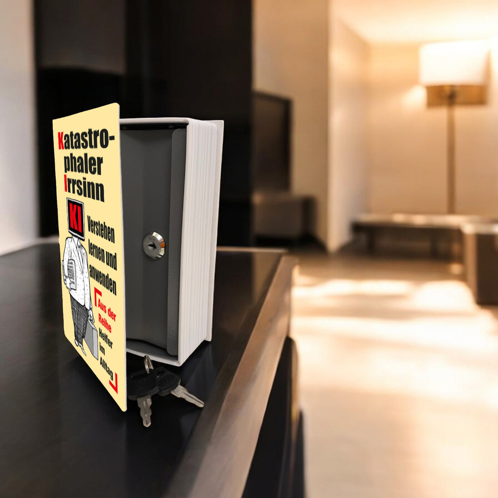 Entdecken Sie das perfekte Zusammenspiel aus Spaß und Funktionalität mit unserem KI lernen und anwenden Booksafe . Dieses originelle Meisterwerk kombiniert die Faszination für künstliche Intelligenz mit heimlicher Sicherheitsfunktion. Ideal für alle, die mehr als nur staubige Regale haben möchten! Mit zwei praktischen Größen zur Auswahl – 12x18 cm und 15,5x24 cm – passt es perfekt in jedes Bücherregal, während es Ihre kleinen Geheimnisse sicher bewahrt.Die Vorderseite ziert ein humorvolles Comic-Motiv eines Mannes mit Bildschirmkopf und dem kecken Spruch: „Katastrophaler Irrsinn. KI verstehen lernen und anwenden“. Dies sorgt bei jedem Technikliebhaber für ein Schmunzeln und kreative Denkanstöße. Schenken Sie Ihren Freunden ein Gesprächsstarter: Sie werden sicher hinterfragen, ob Sie tatsächlich die neusten KI-Entwicklungen verstecken, während Sie gleichzeitig Traum-Versteck für süße Leckereien geschaffen haben.Dieses Booksafe eignet sich wunderbar als durchdachtes Geschenk für Gelegenheiten wie Geburtstage oder Weihnachten – oder einfach als witzige Überraschung zwischendurch. Mit seiner cleveren Doppelfunktion zeigt es Ihre Wertschätzung für Humor und Intelligenz. Schlagen Sie jetzt zu und sichern Sie sich ein Stück skurrilen Alltagshelfer-Charme!