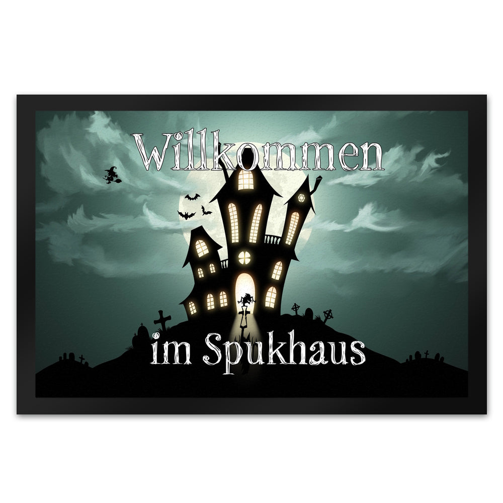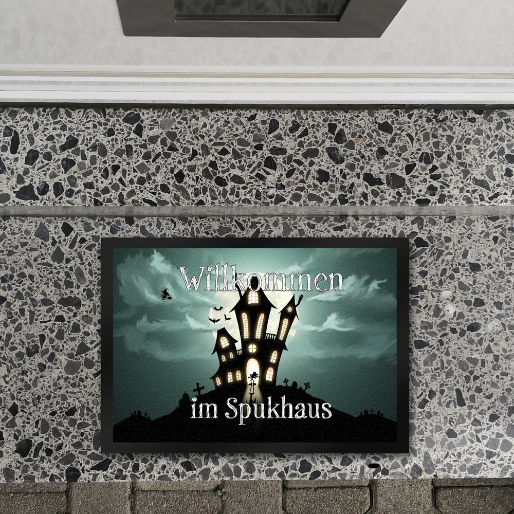 Fußmatte mit gruseligem Halloween Motiv und Spruch - Willkommen im Spukhaus