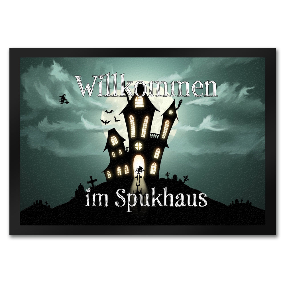 • 1x Fußmatte mit gruseligem Halloween Motiv und Spruch - Willkommen im Spukhaus in der gewählten Größe