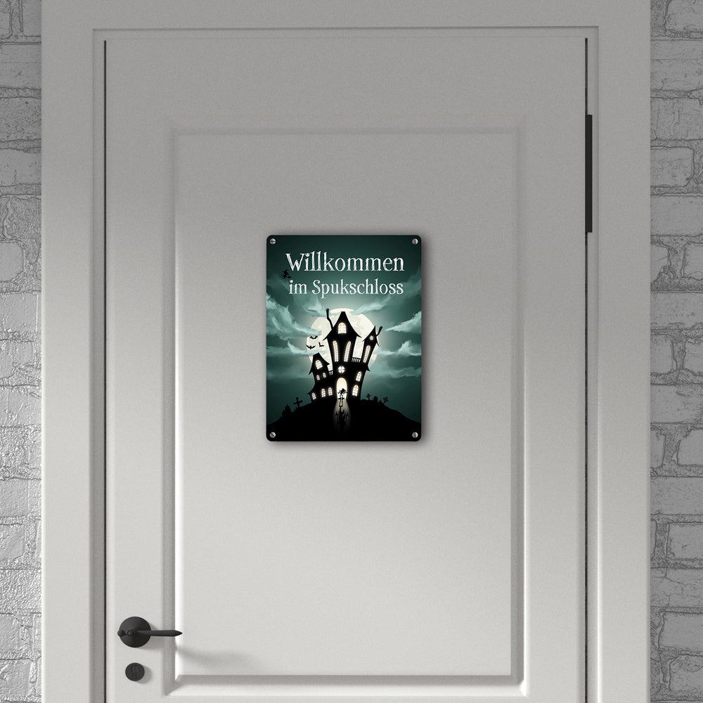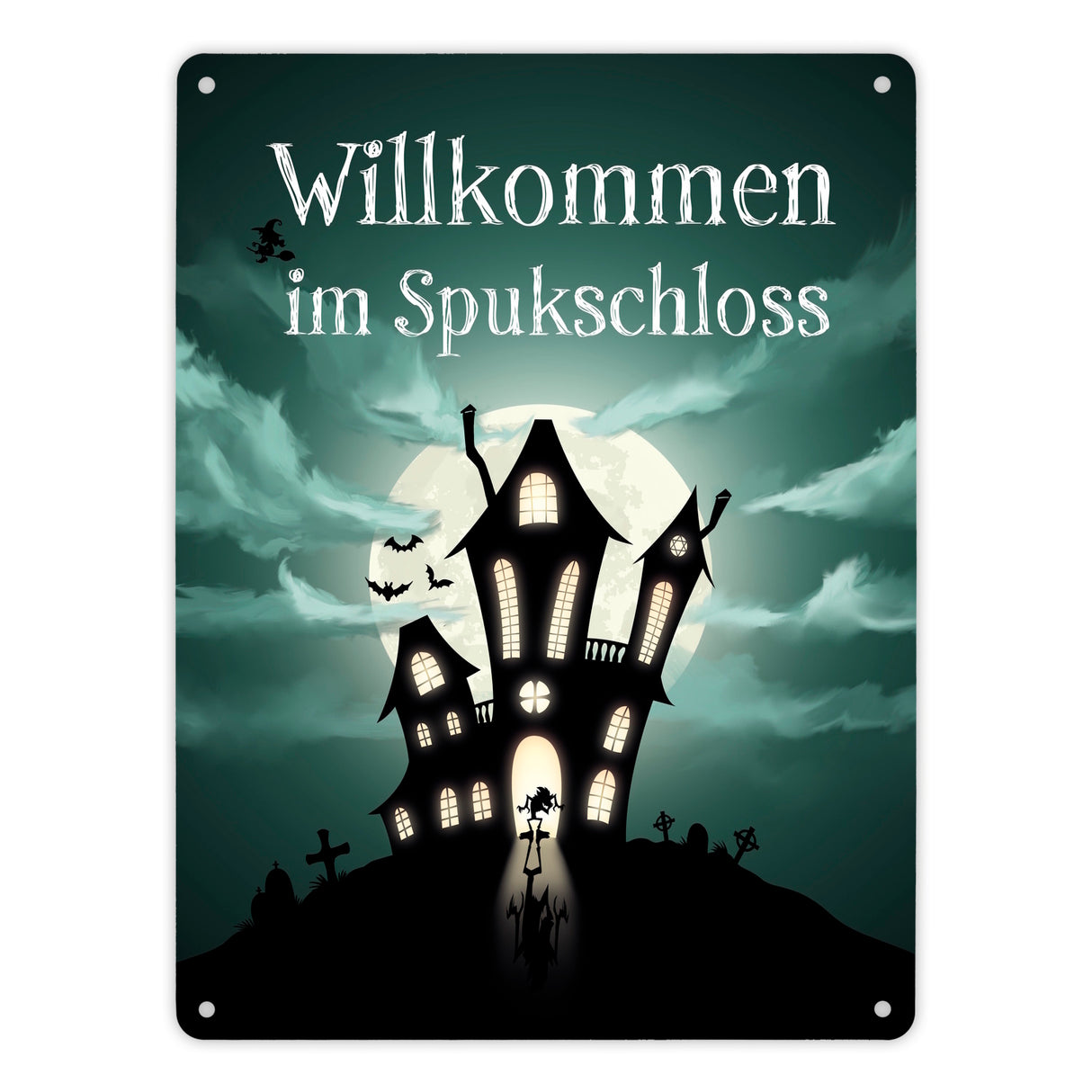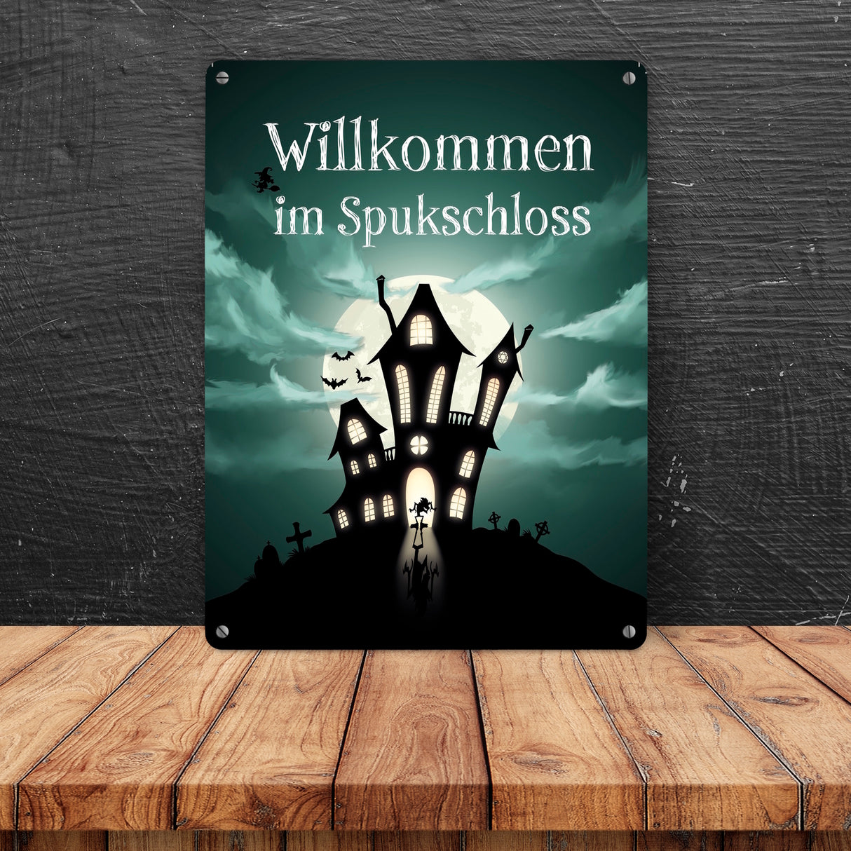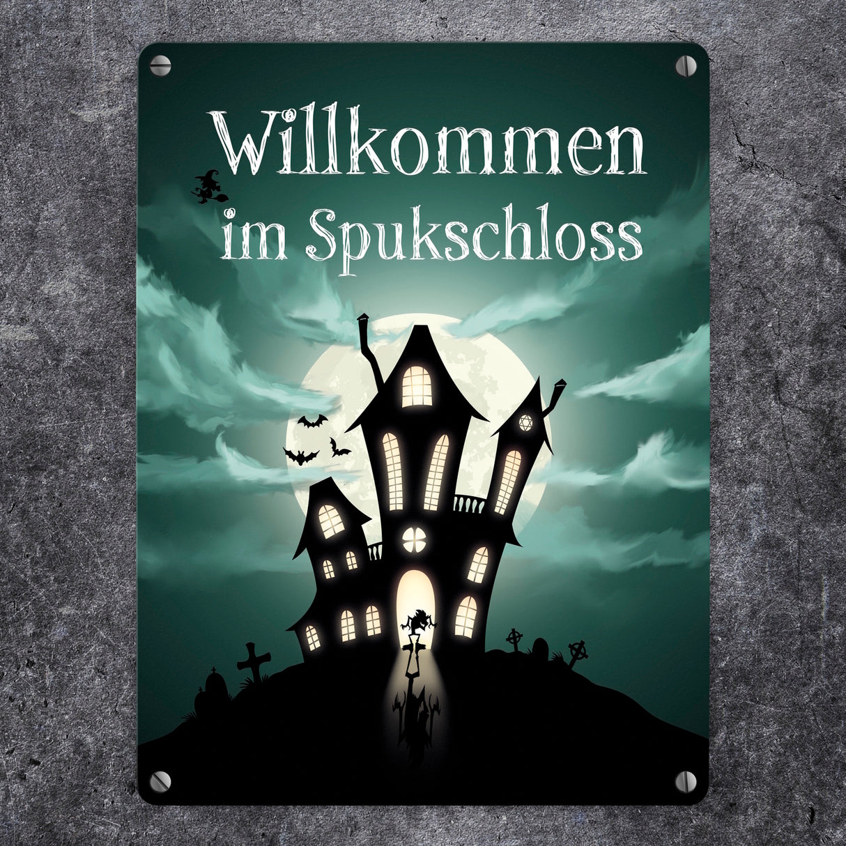 • 1x Metallschild gruseliges Halloween Motiv und Spruch - Willkommen im Spukschloss in der gewählten Größe