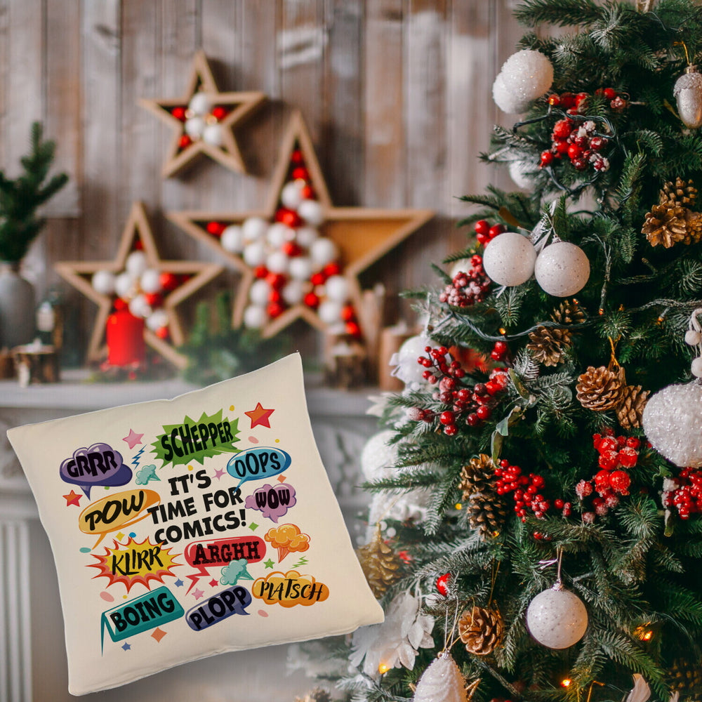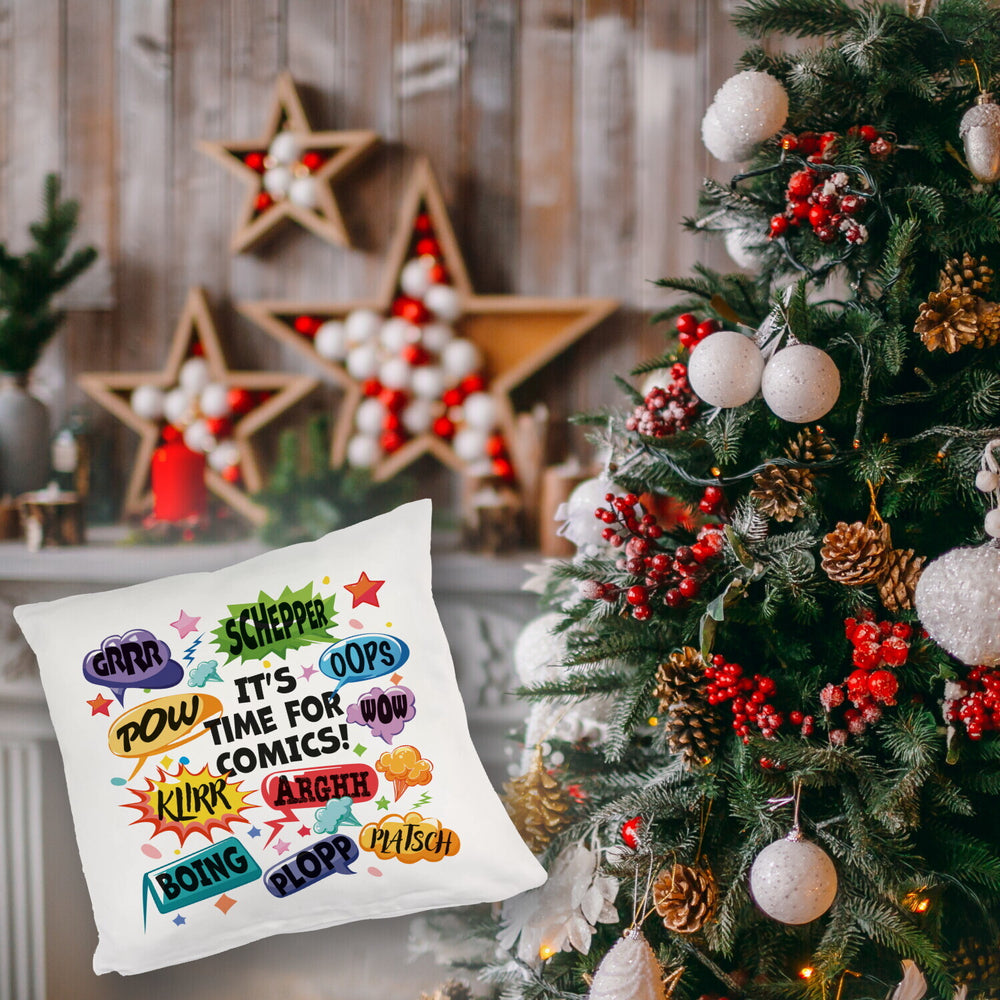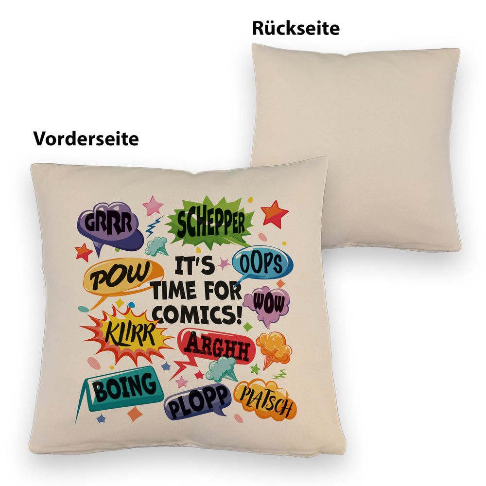 - Dieses Kissen ist ein wahres Fest für die Augen aller Comicfans! Mit bunten Sprechblasen und Buttons in lebhaften Farben und Formen zieht es sofort alle Blicke auf sich. Der darauf gedruckte Spruch „It's time for comics“ bringt zusätzlich Schwung in jedes Wohnzimmer.