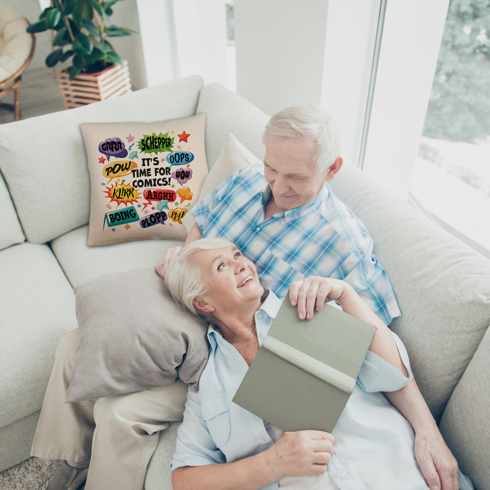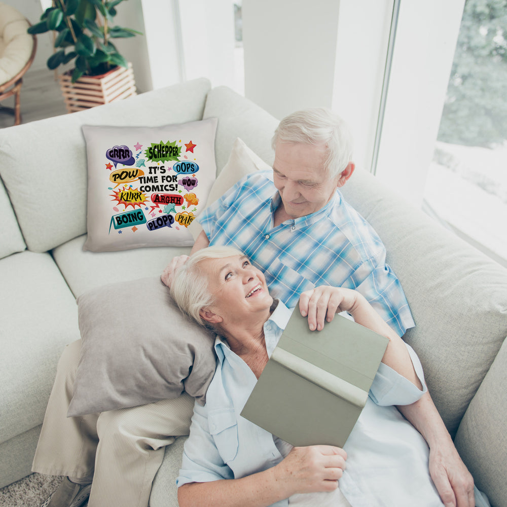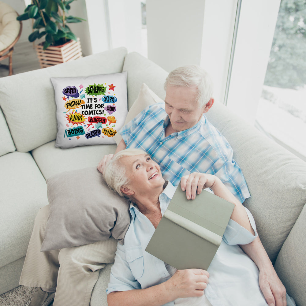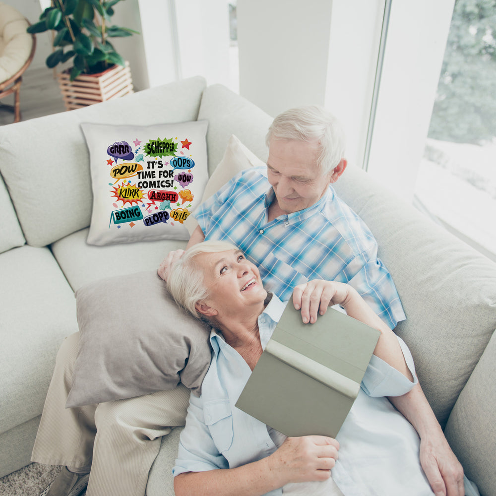 - Dieses Kissen ist ein wahres Fest für die Augen aller Comicfans! Mit bunten Sprechblasen und Buttons in lebhaften Farben und Formen zieht es sofort alle Blicke auf sich. Der darauf gedruckte Spruch „It's time for comics“ bringt zusätzlich Schwung in jedes Wohnzimmer.