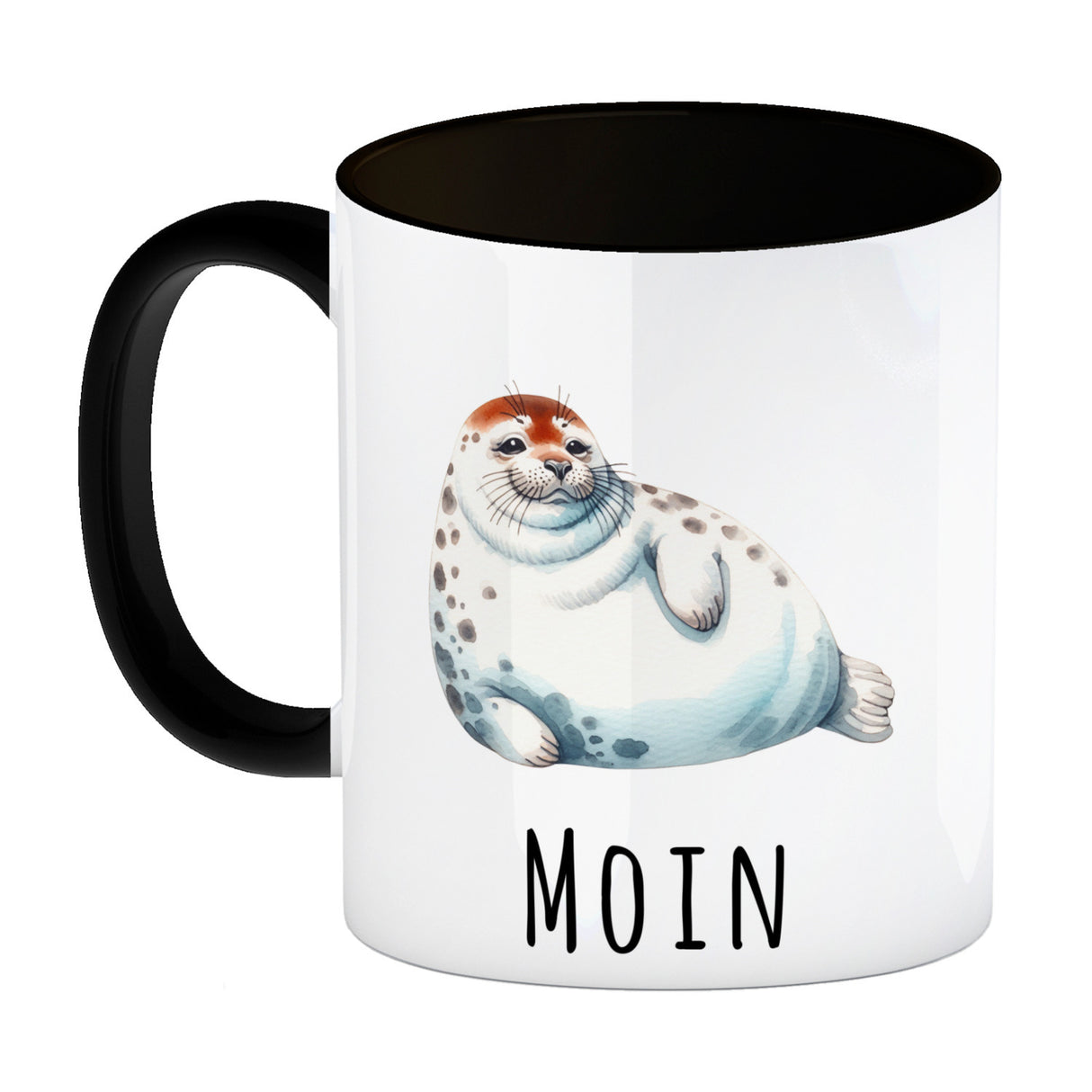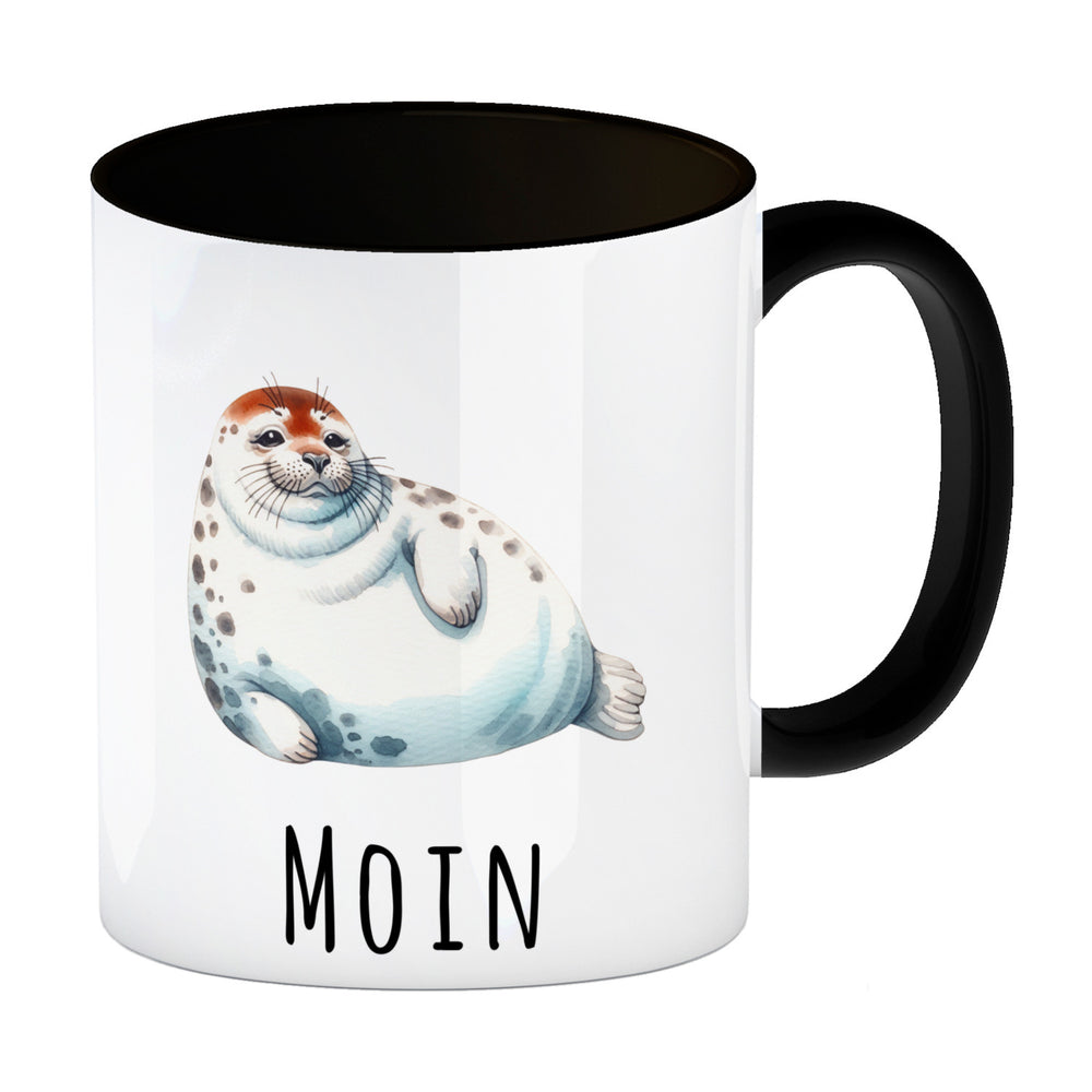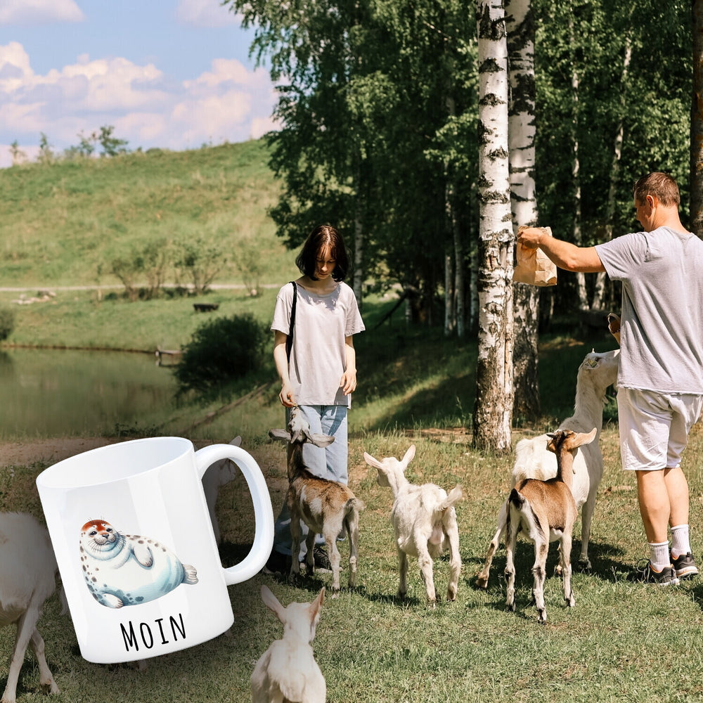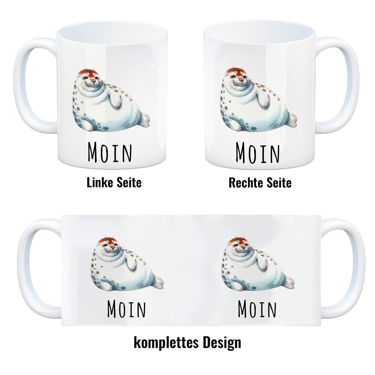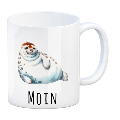 - 1x Dicke Robbe Kaffeebecher mit Spruch Moin in der gewählten Ausführung