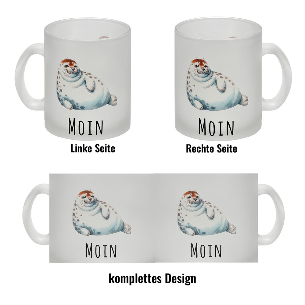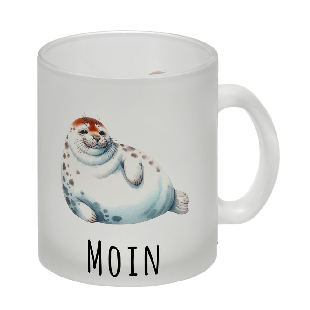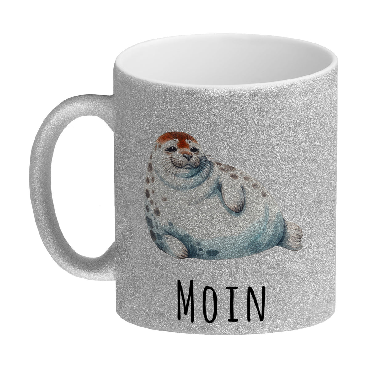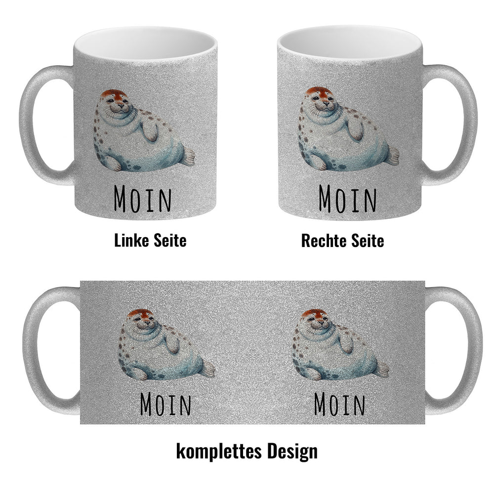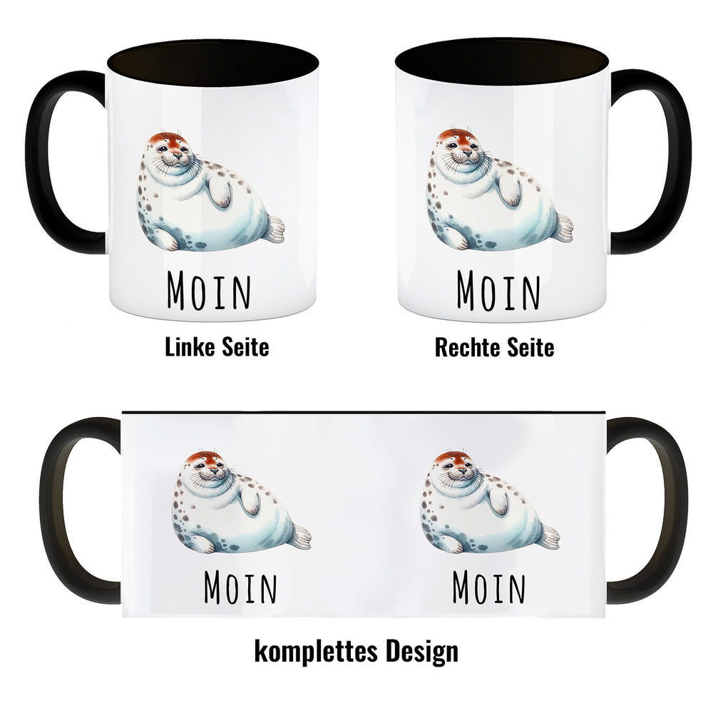 - 1x Dicke Robbe Kaffeebecher mit Spruch Moin in der gewählten Ausführung