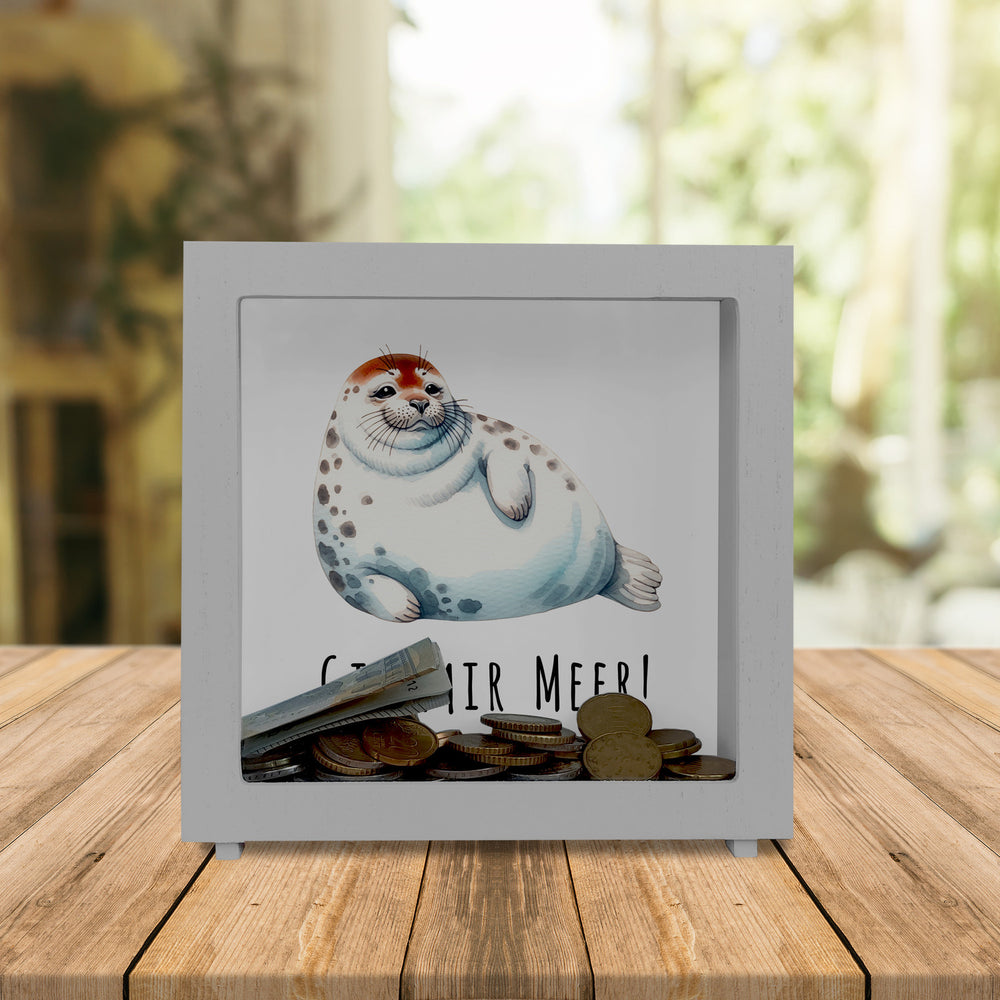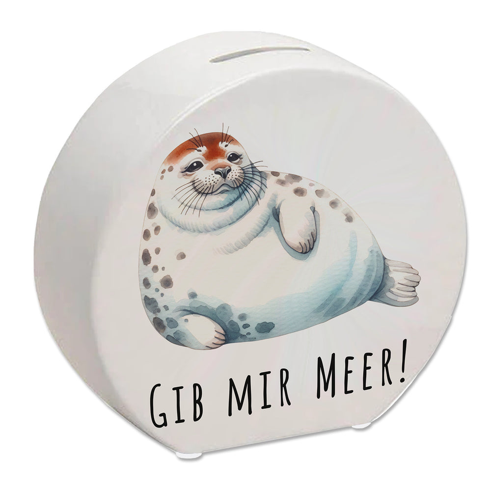 - 1x Dicke Robbe Spardose mit Spruch Gib mir Meer in der gewählten Ausführung