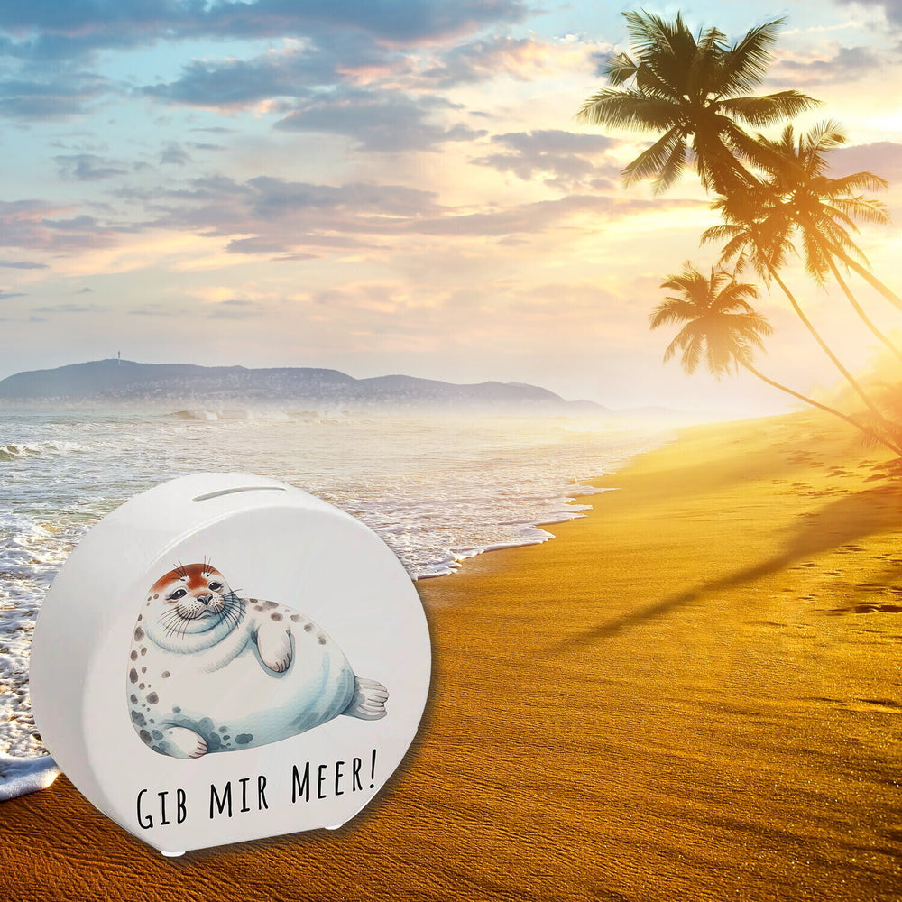 Dicke Robbe Spardose mit Spruch Gib mir Meer