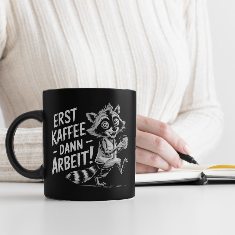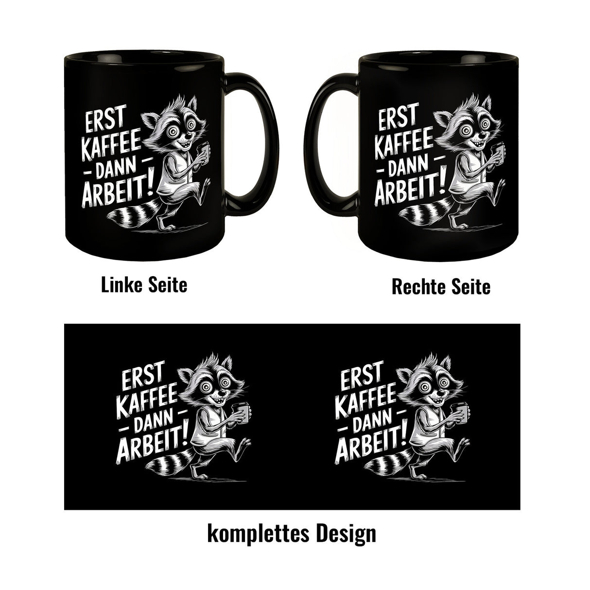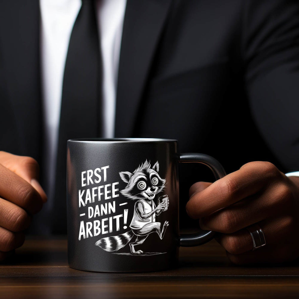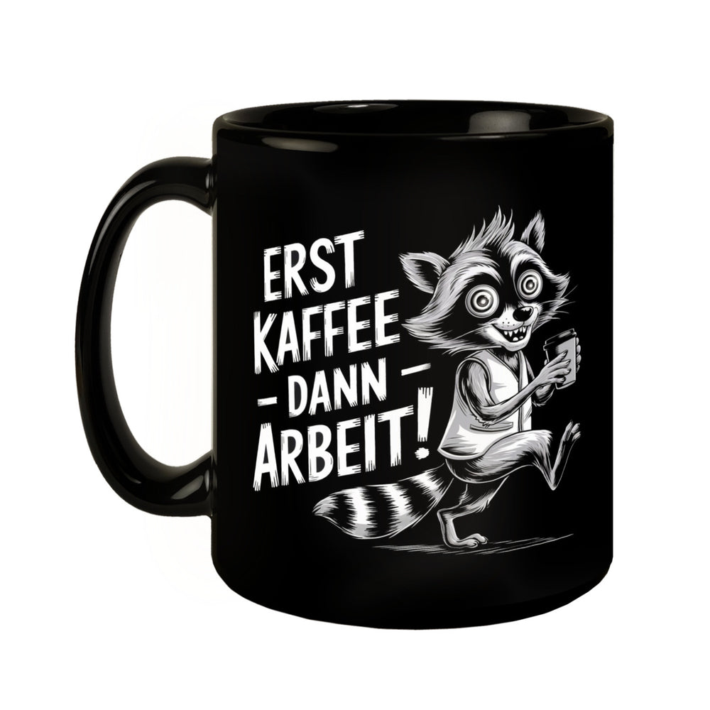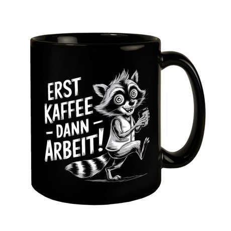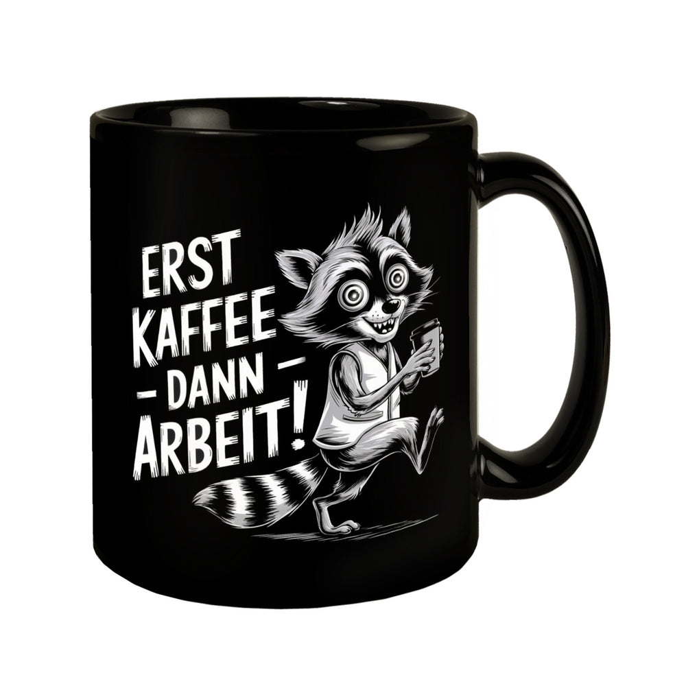 - Starten Sie Ihren Tag mit der "Erst Kaffee - dann Arbeit" Tasse! Diese schwarze Kaffeetasse ist perfekt für Koffein-Junkies, die einen kleinen Schubs am Morgen brauchen. Der verrückte Waschbär mit spiralförmigen Augen und wildem Haar bringt garantiert ein Lächeln auf Ihr Gesicht!