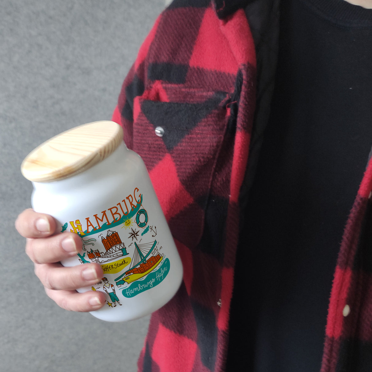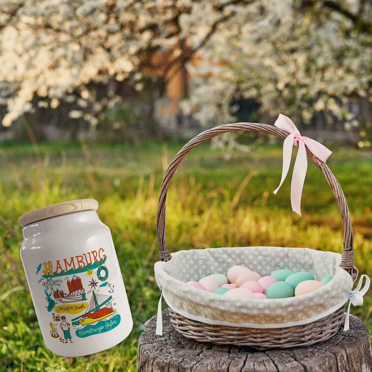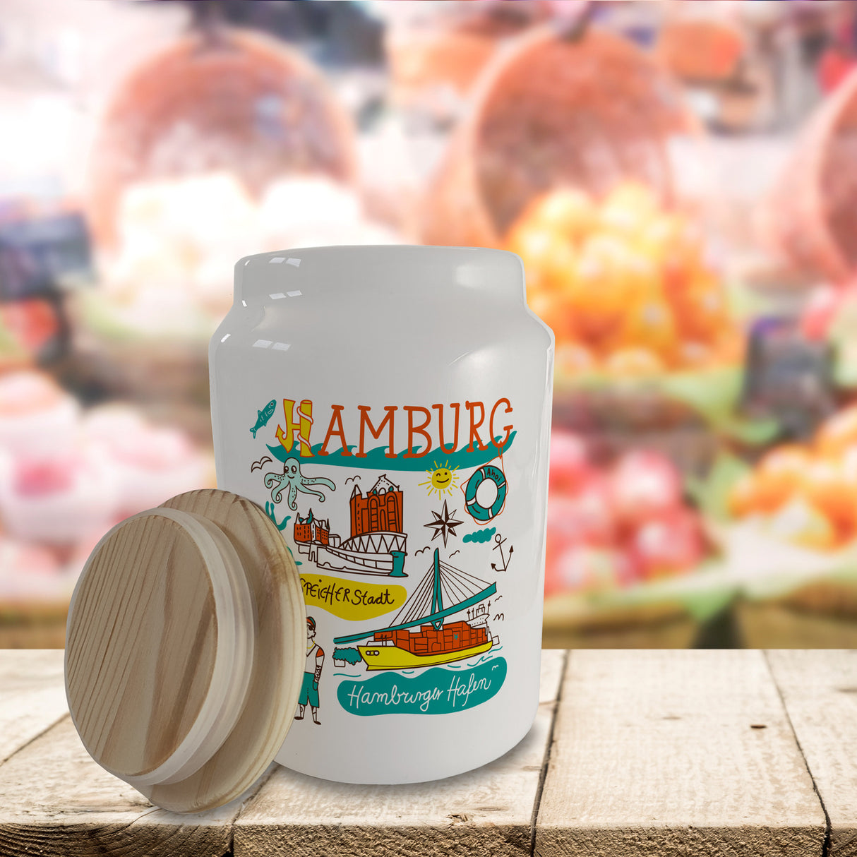 Die Hamburg Wimmelbild Keksdose ist ein echtes Highlight für alle Hamburg-Fans! Mit lebhaften Farben und ikonischen Motiven wie der Elbphilharmonie und der Speicherstadt bringt sie das maritime Flair Hamburgs in jede Küche. Der Rettungsring und der Schrif Hinweise: Material: Keramik und Holz / Volumen 650 ml