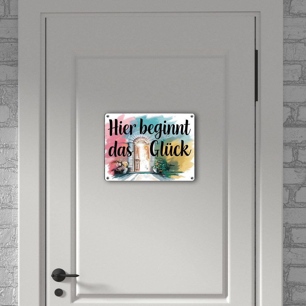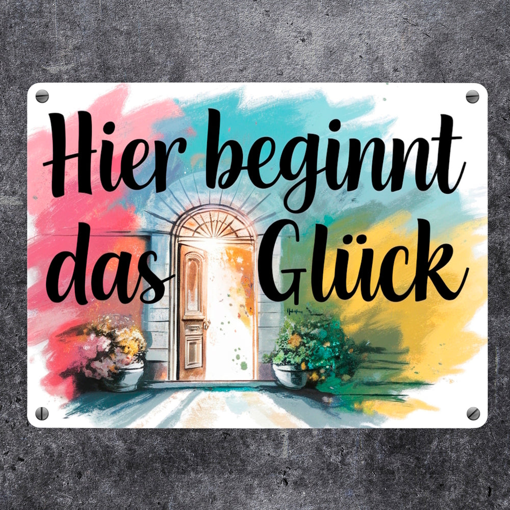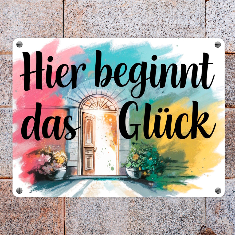 - Dieses kunstvolle Metallschild beeindruckt durch sein einladendes Design: Eine offene Tür strahlt Licht aus, symbolisiert neue Anfänge und ist umrahmt von lebendigen Aquarellfarben in Pink, Blau und Gelb. Üppige Topfpflanzen flankieren die Tür, während der Spruch "Hier beginnt das Glück" in eleganten Kursivbuchstaben thront.