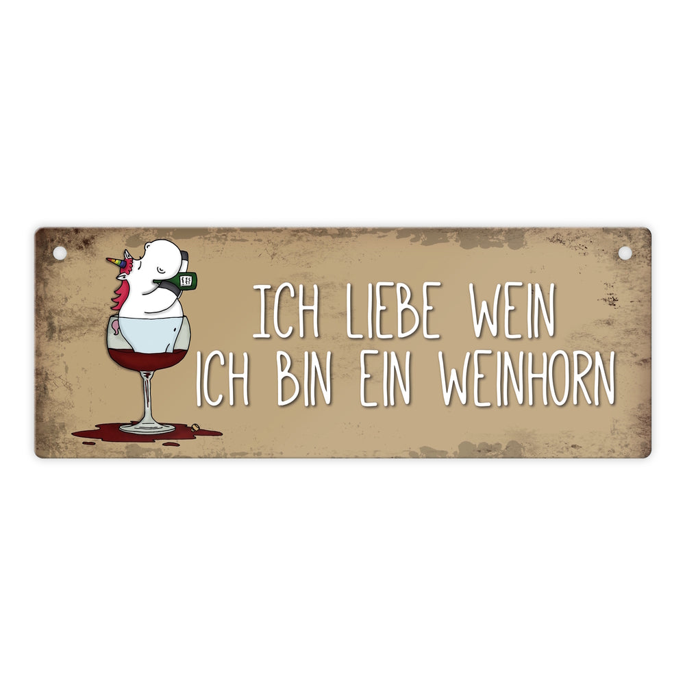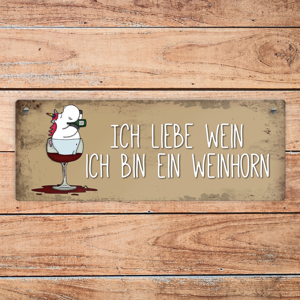 Honeycorns Metallschild mit Einhorn Motiv und Spruch: Ich liebe Wein, ich bin ein Weinhorn