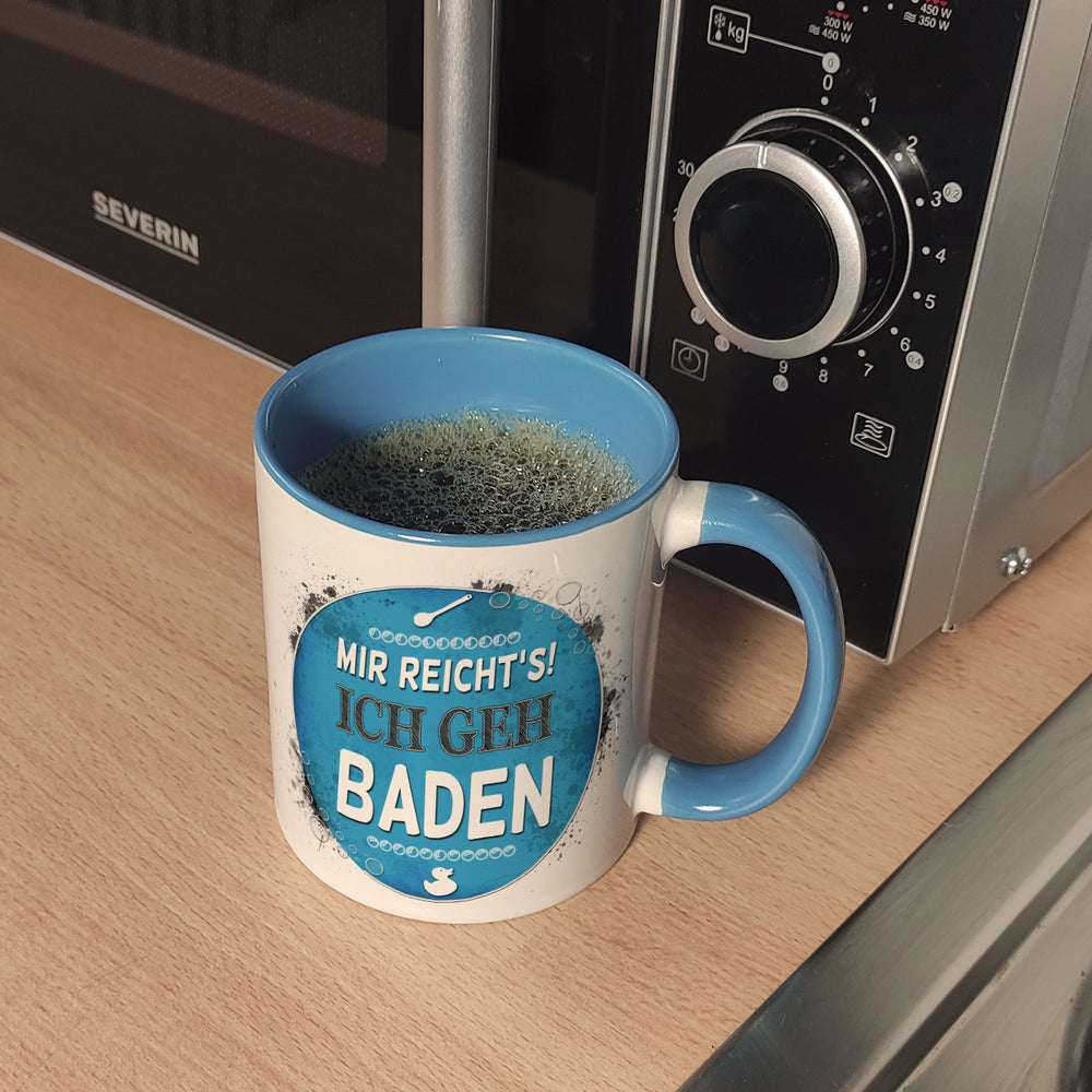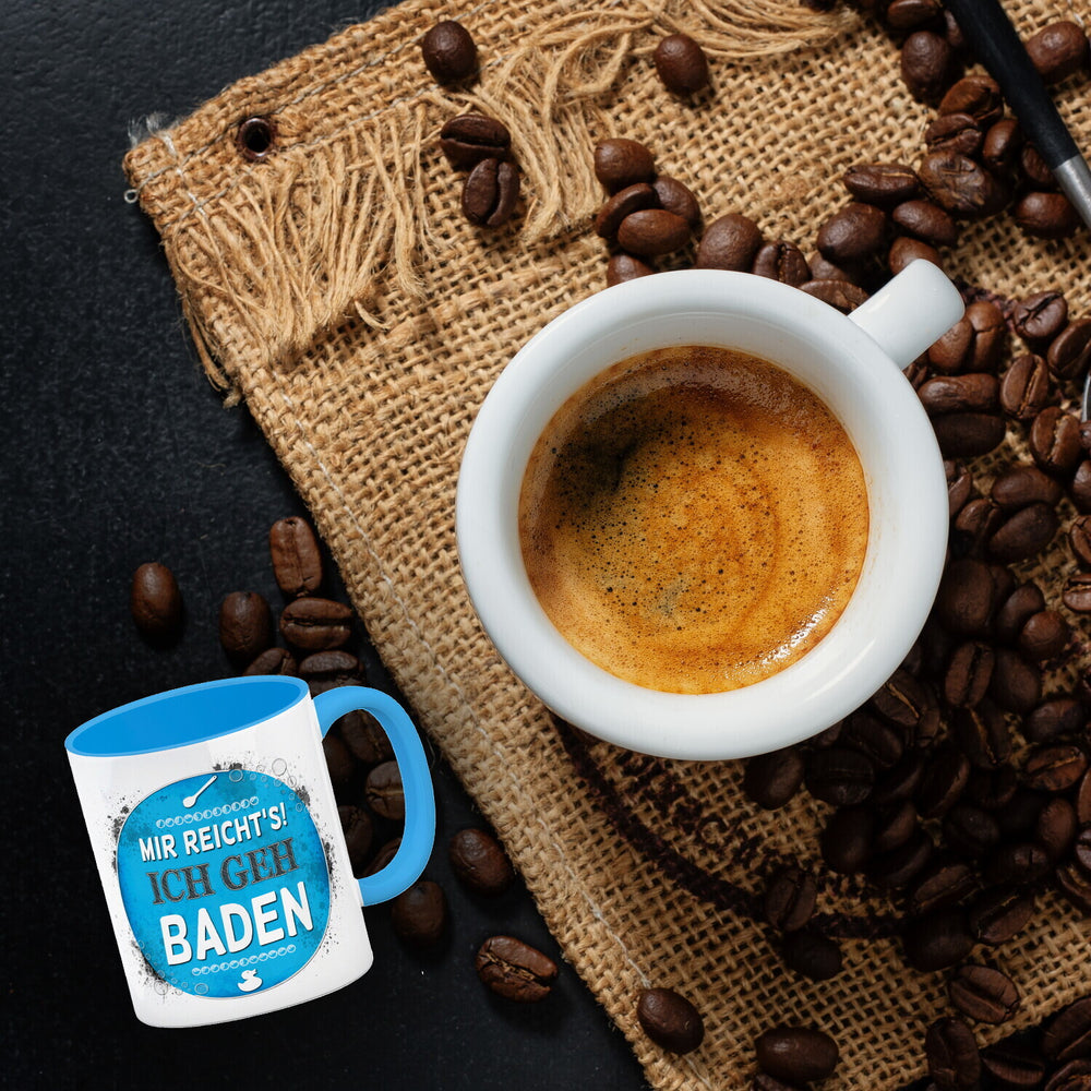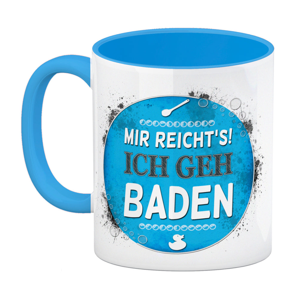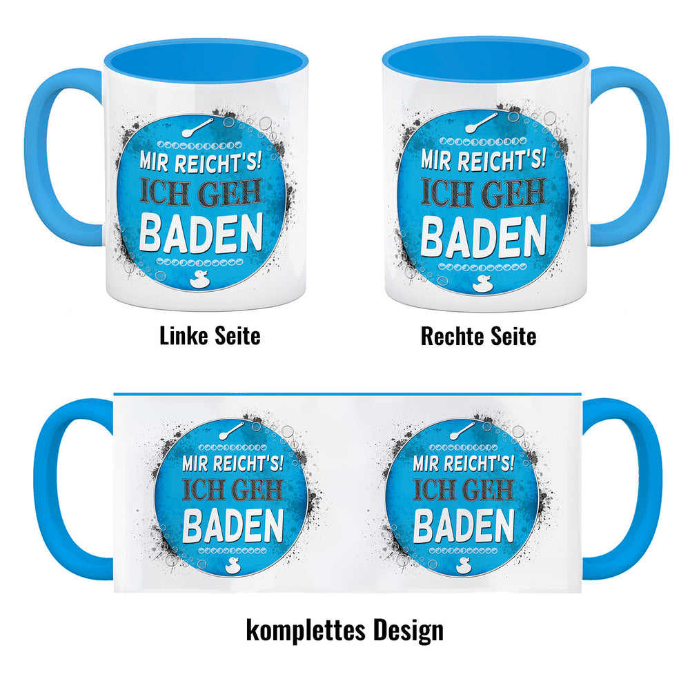 - 1x Kaffeebecher mit Spruch: Mir reicht's! Ich geh baden in der gewählten Ausführung