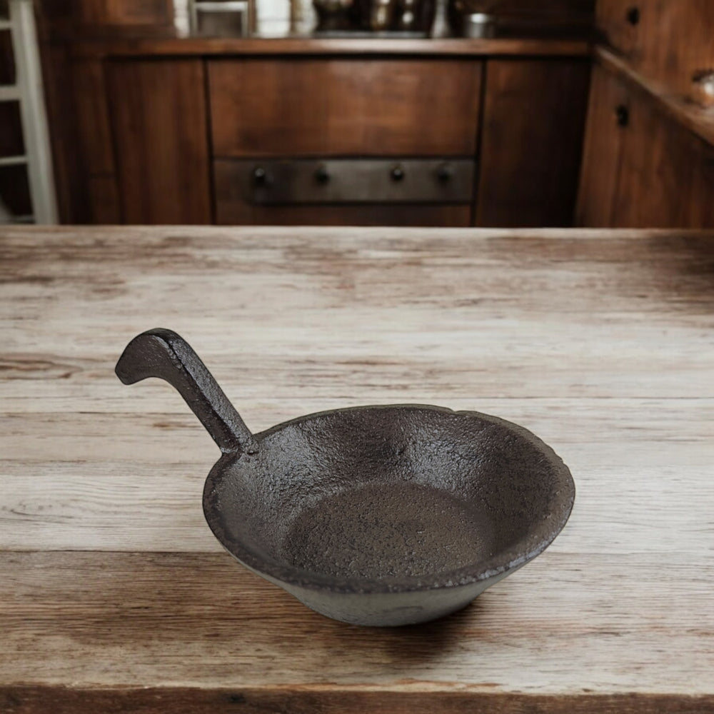 - Das charmante Design aus Gusseisen, gefertigt wie eine kleine Pfanne mit Fingergriff, macht diesen Kerzenständer einzigartig. Mit einem Durchmesser von 5 cm ist er ideal für Teelichter oder Stabkerzen. Perfekt als rustikales Dekorationsstück, das jedes Zimmer aufwertet!