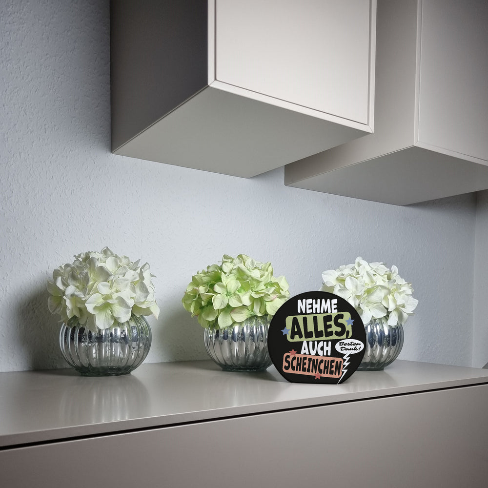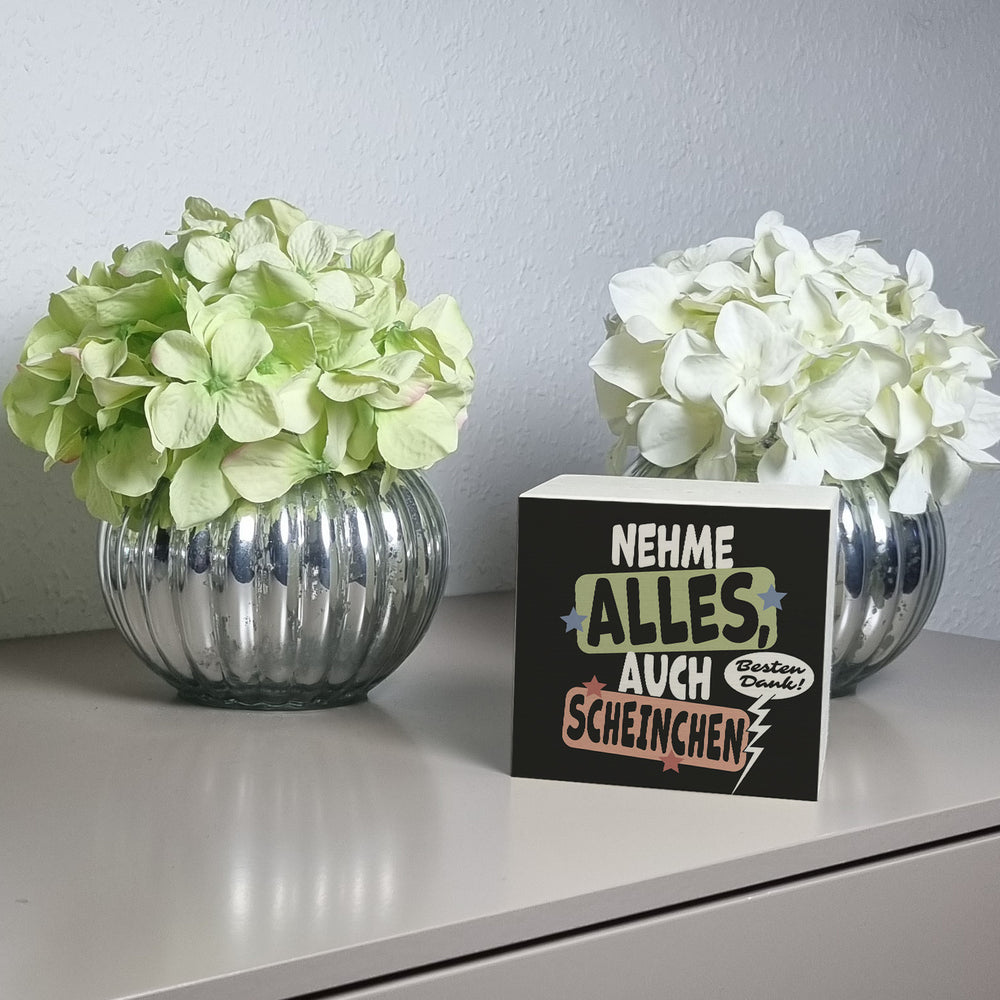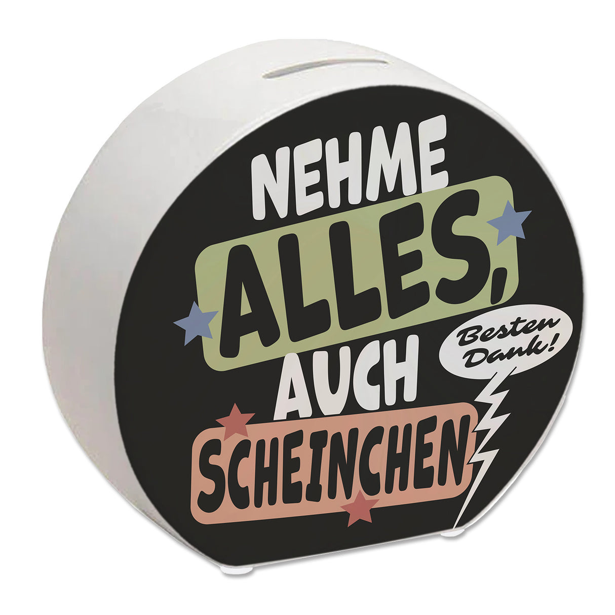- Verabschiede dich von leeren Taschen! Unsere „Nehme alles“ Spardose ist perfekt für die Aufbewahrung von Geldscheinen und Münzgeld. Das witzige Design mit dem frechen Spruch „Nehme alles, auch Scheinchen - Besten Dank!“ bringt garantiert jeden zum Schmunzeln.
