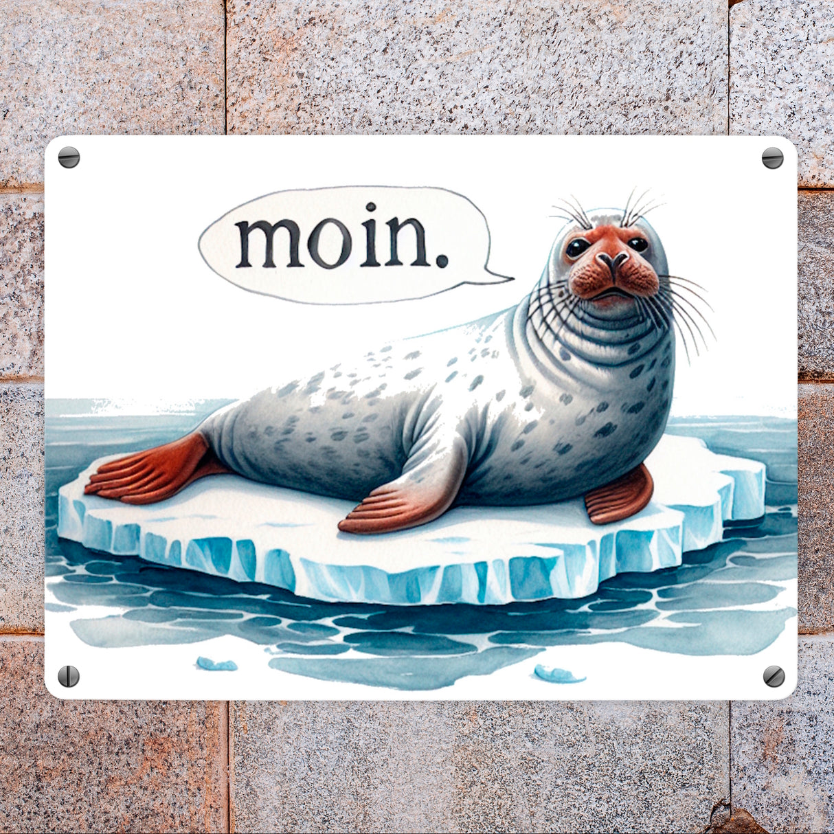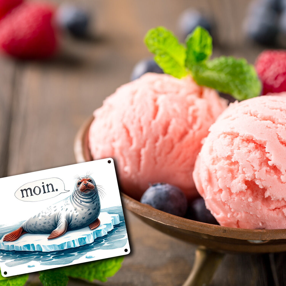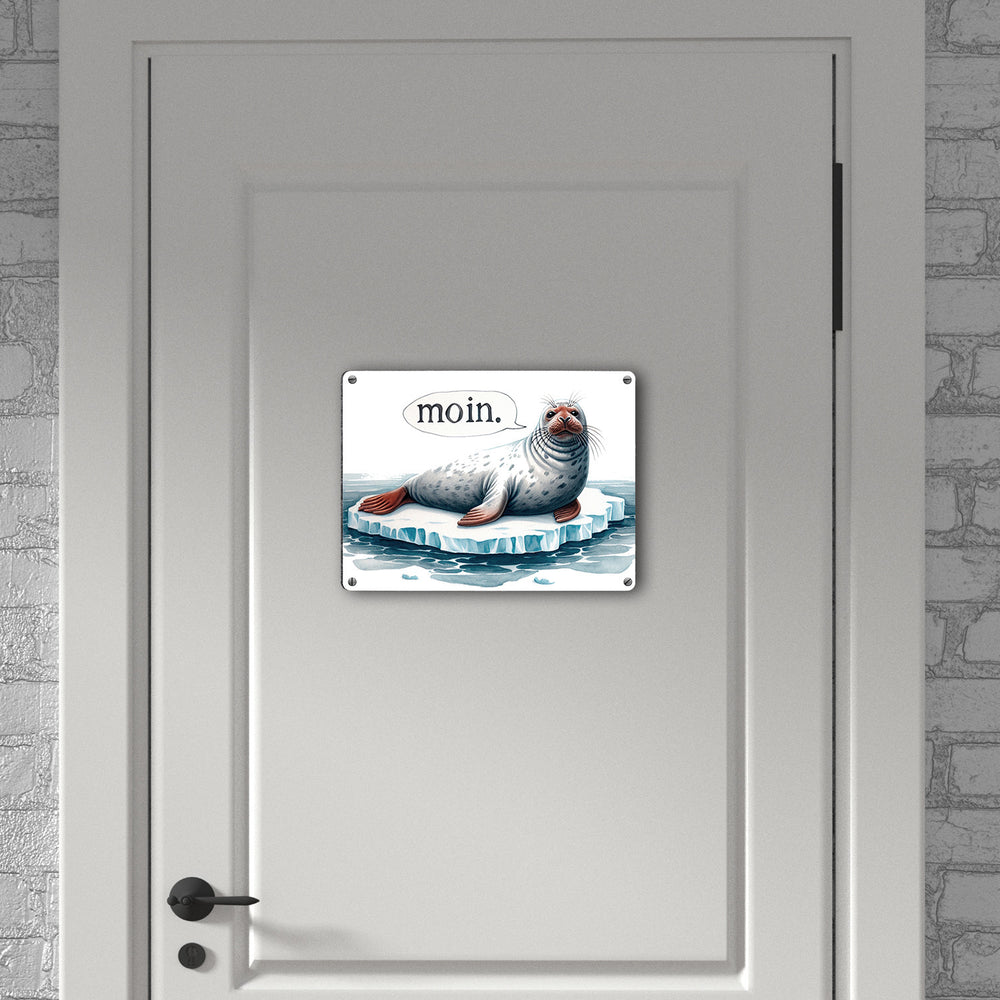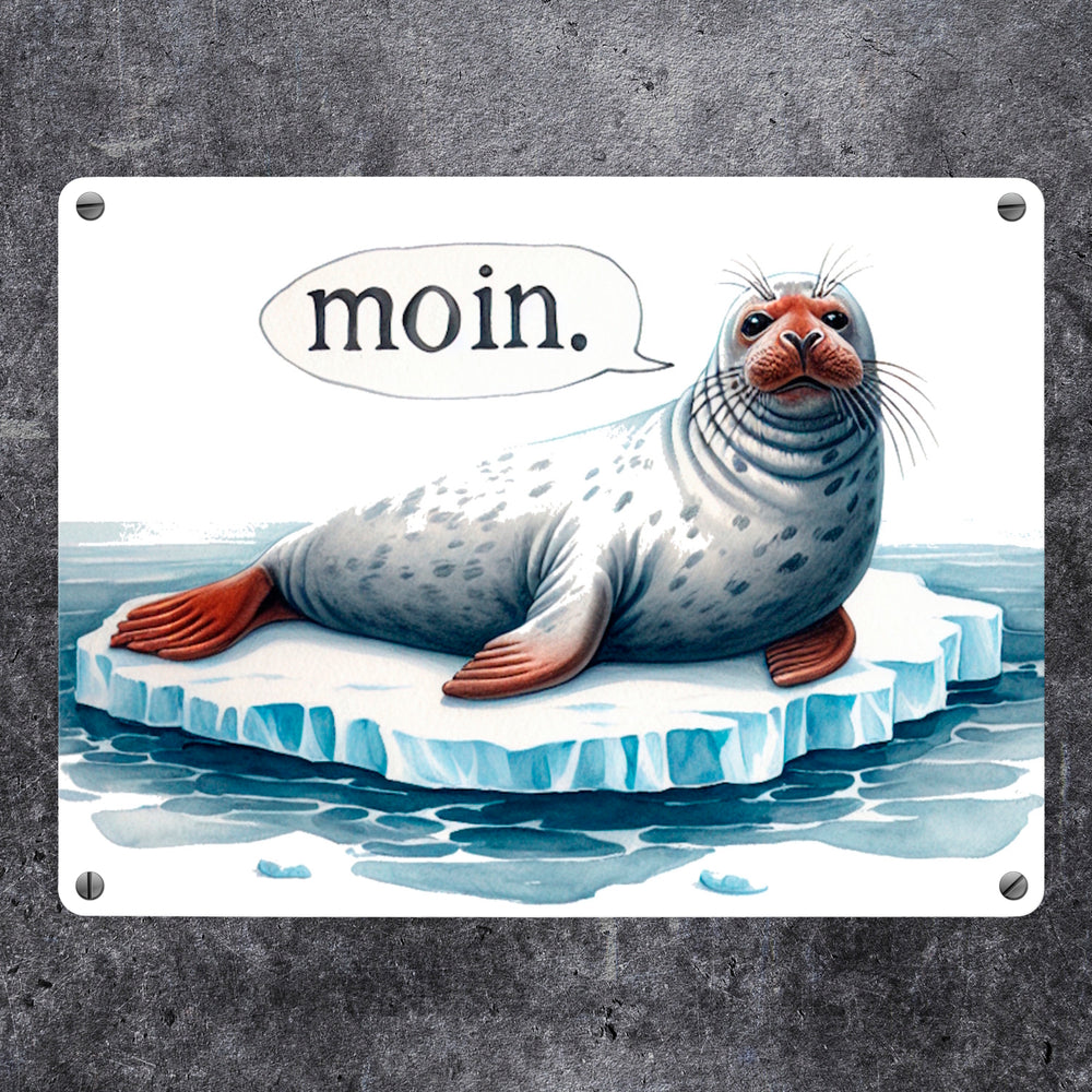 - Willkommen in der frostigen Welt der Robben! Dieses Metallschild zeigt eine dicke Robbe, die chillig auf einer Eisscholle liegt und „MOIN“ ruft. Perfekt für alle, die das kalte Ambiente der Antarktis lieben.