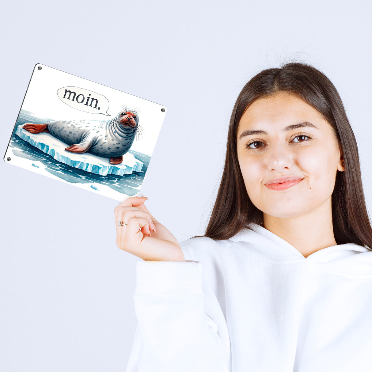 - 1x Robbe auf Eisscholle Metallschild in 15x20 cm mit Spruch Moin in der gewählten Größe
