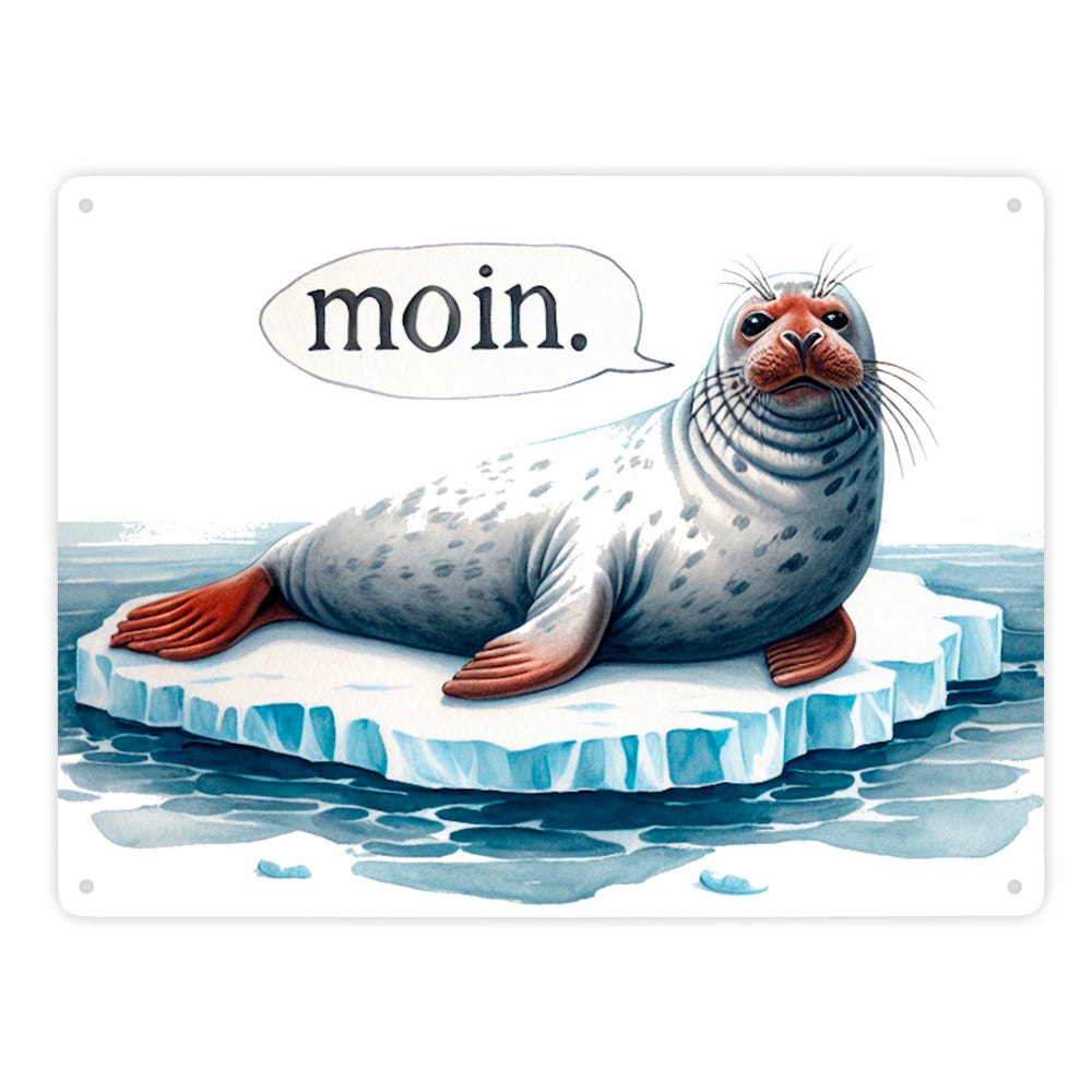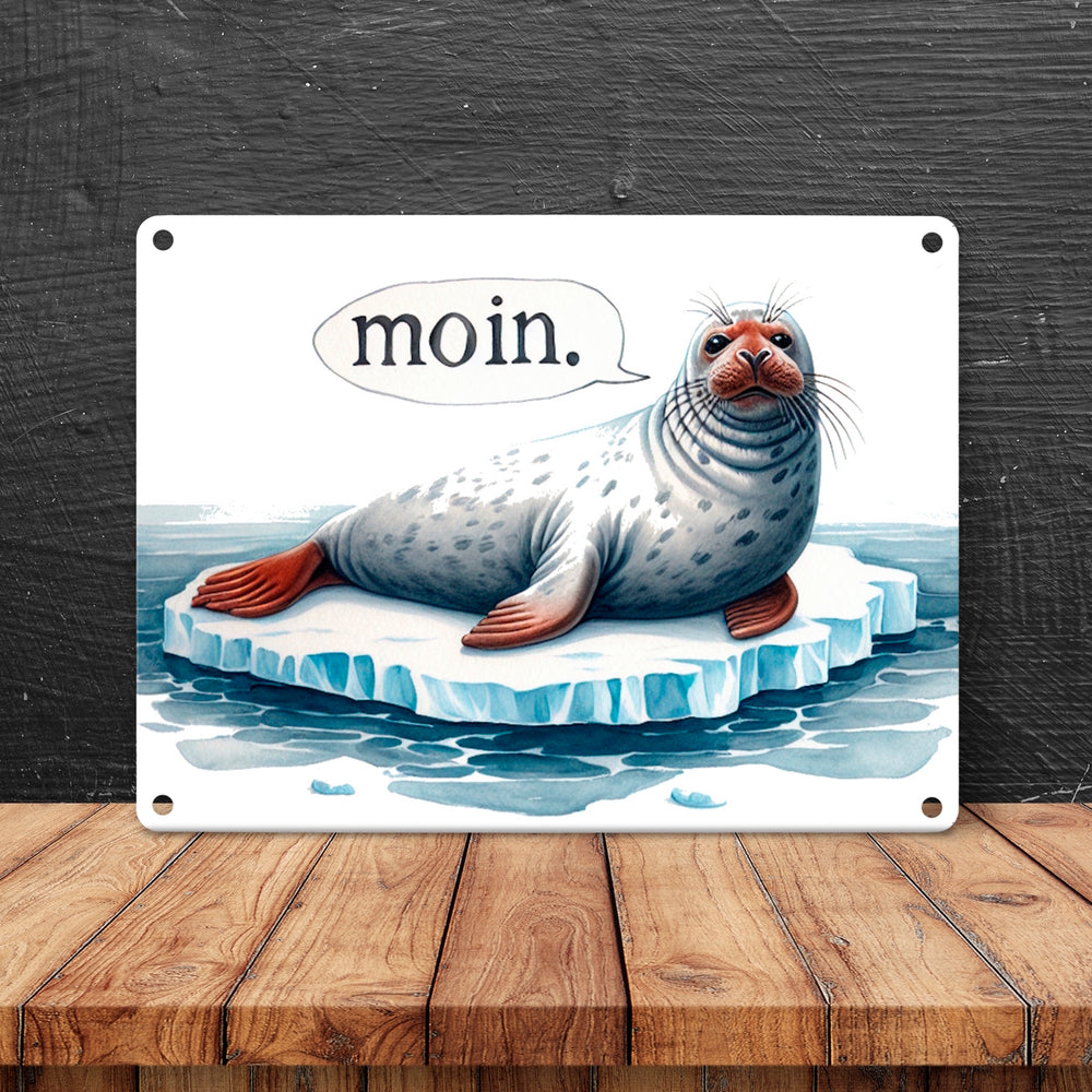 Robbe auf Eisscholle Metallschild in 15x20 cm mit Spruch Moin