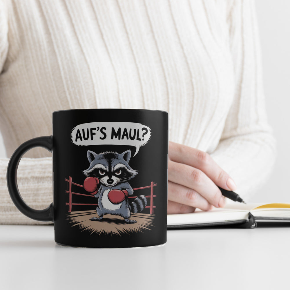 - Dieser Kaffeebecher ist der perfekte Begleiter für alle, die ihren Morgenkaffee mit einer Prise Humor genießen möchten. Das Highlight? Ein Waschbär im hölzernen Boxring, der mit ernster Miene und Boxhandschuhen bereit ist, dir ein schlagkräftiges Lächeln ins Gesicht zu zaubern – Sprechblase inklusive: "Auf's Maul?"