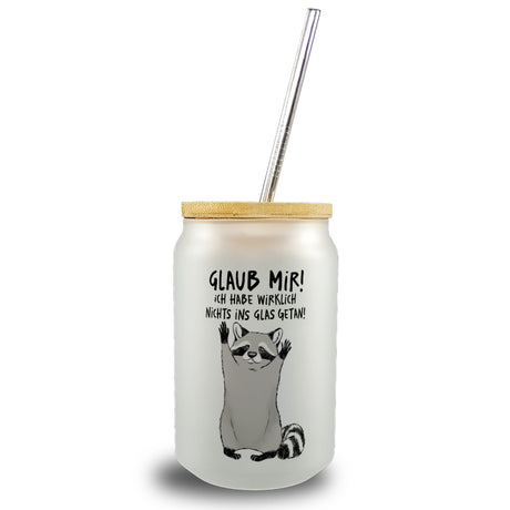 Waschbär Trinkglas mit Bambusdeckel mit Spruch Glaub mir Ich habe wirklich nichts ins Glas getan