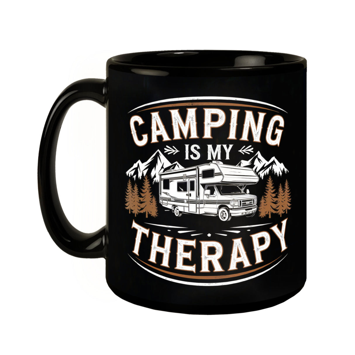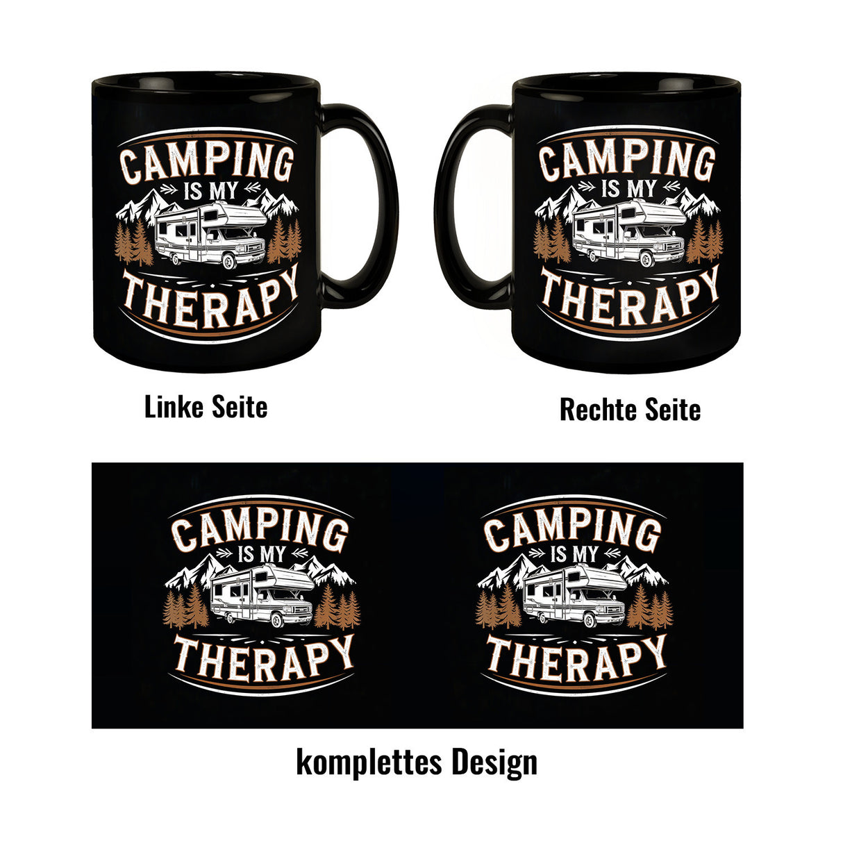 • Ah, die Magie des Campings! Auf unserer "Camping is my Therapy" Tasse scheint das Wohnmobil inmitten einer traumhaften Berglandschaft wie ein Held auf Abenteuer-Tour. Mit ihrem schwarzen Hintergrund, dem orangen Spruch und weißen Buchstaben verspricht sie: Jedes Camping-Abenteuer beginnt ab jetzt mit einem Lächeln!