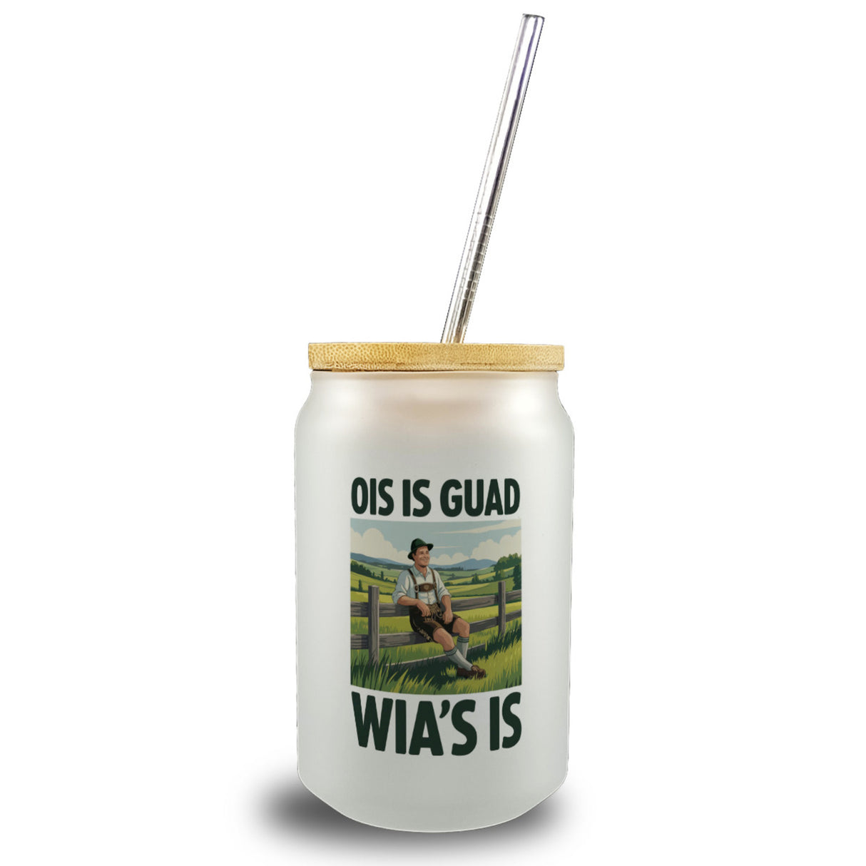 - Dieses humorvolle Trinkglas zeigt einen zufriedenen Bauern, der lässig an einem Holzzaun lehnt. Gekleidet in traditioneller bayerischer Tracht, blickt er über saftige, grüne Hügel. Der freche Spruch "Ois is guad, wia’s is" prangt stolz darüber. Perfekt für Liebhaber der bayerischen Lebensart und minimalistischem Design!