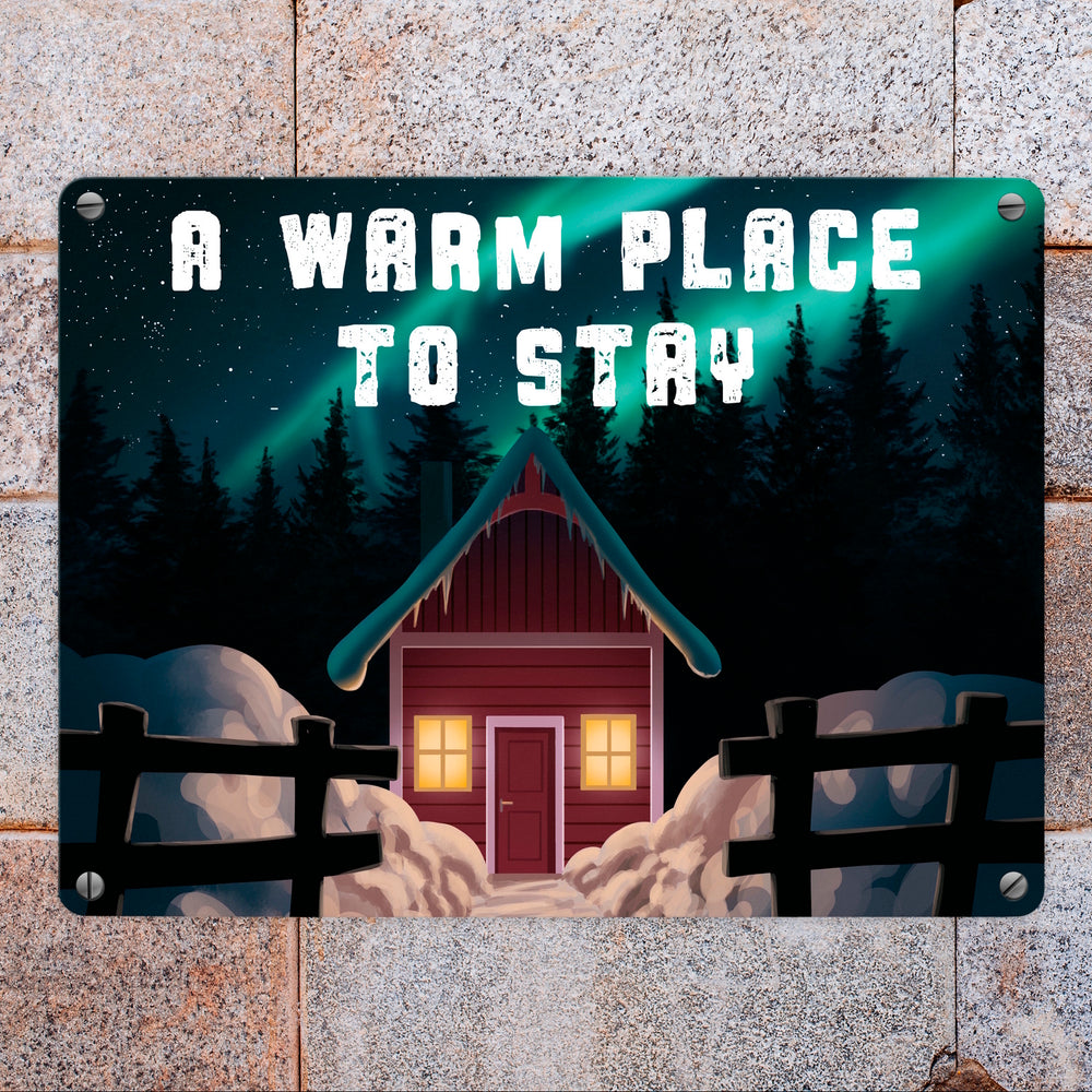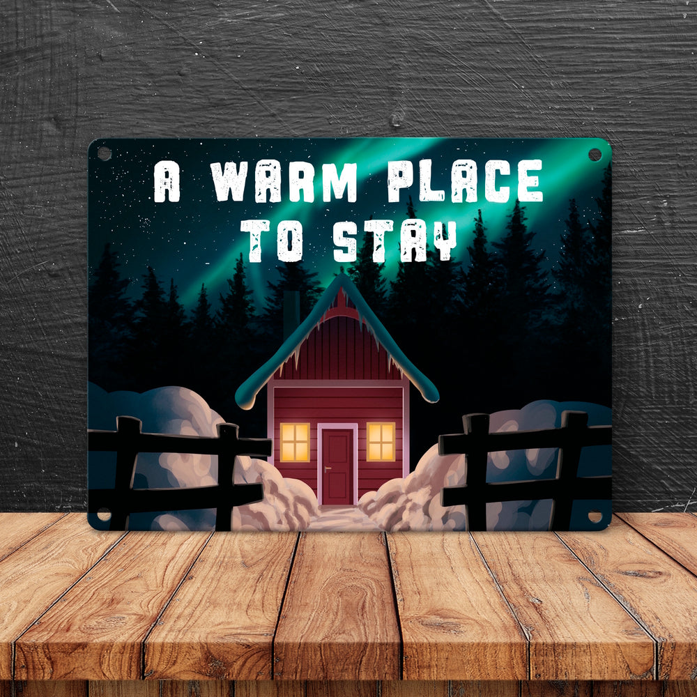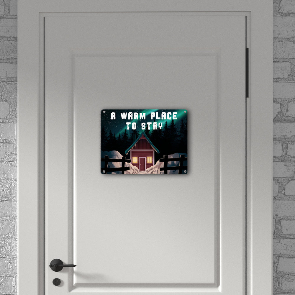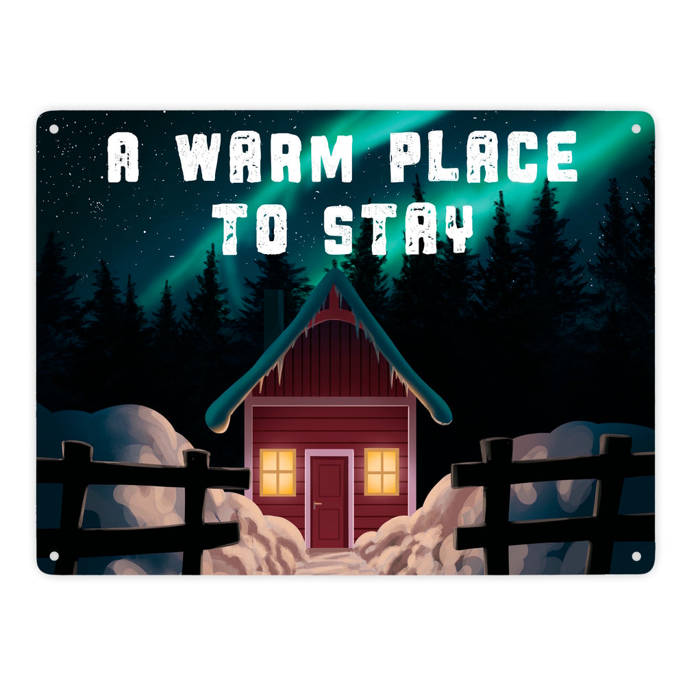 A warm place to stay Metallschild mit nordischer Hütte und Polarlichtern