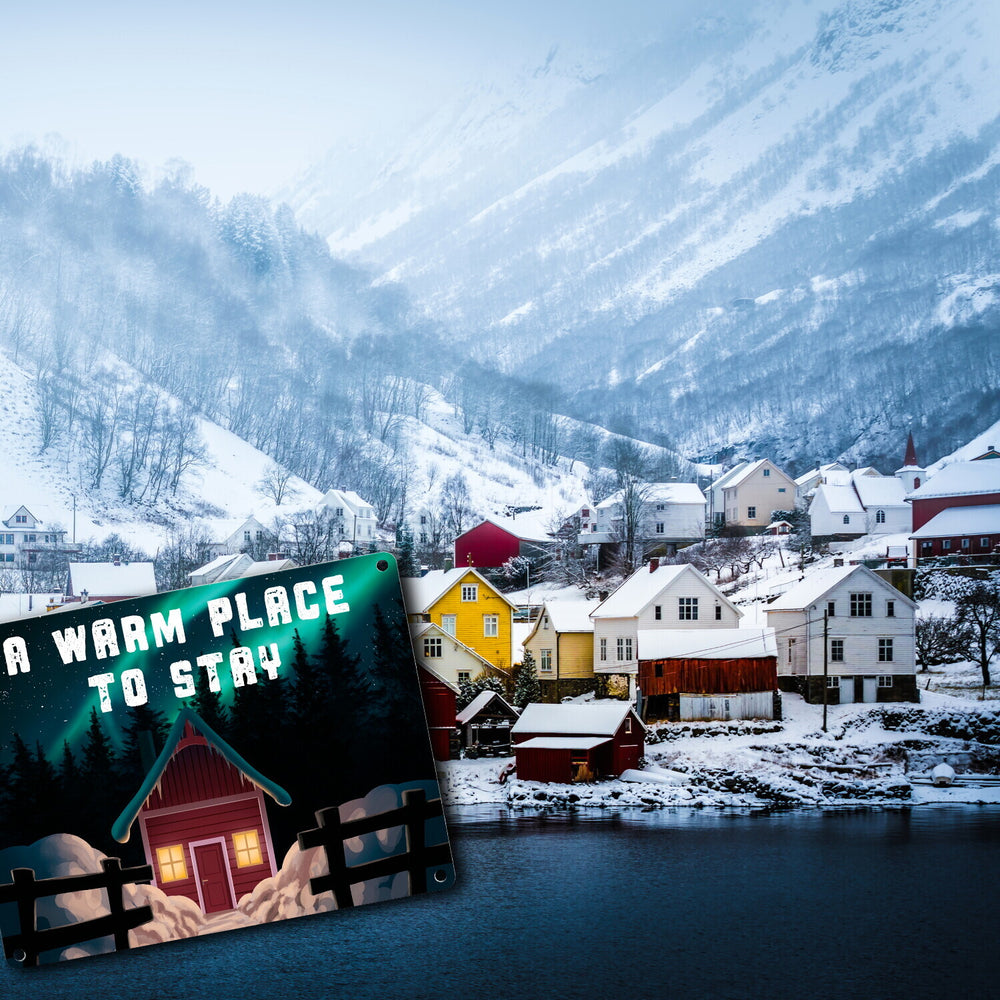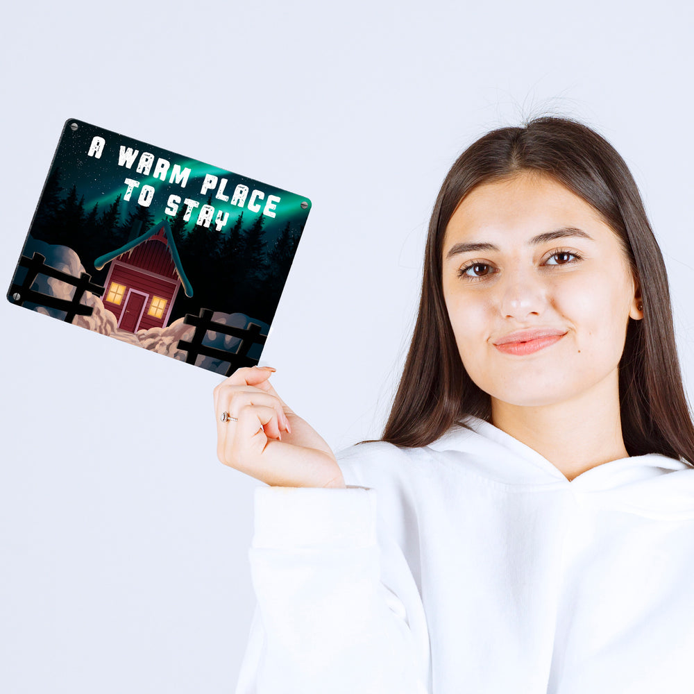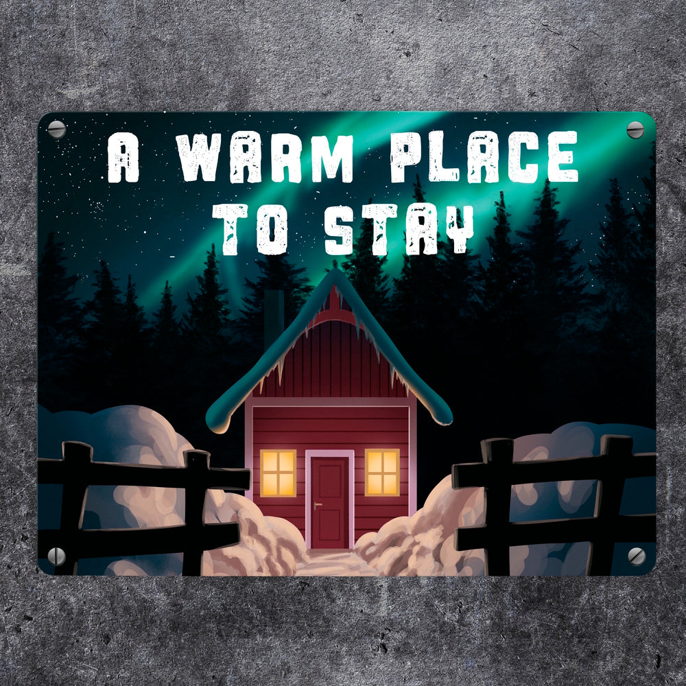 - 1x A warm place to stay Metallschild mit nordischer Hütte und Polarlichtern in der gewählten Größe