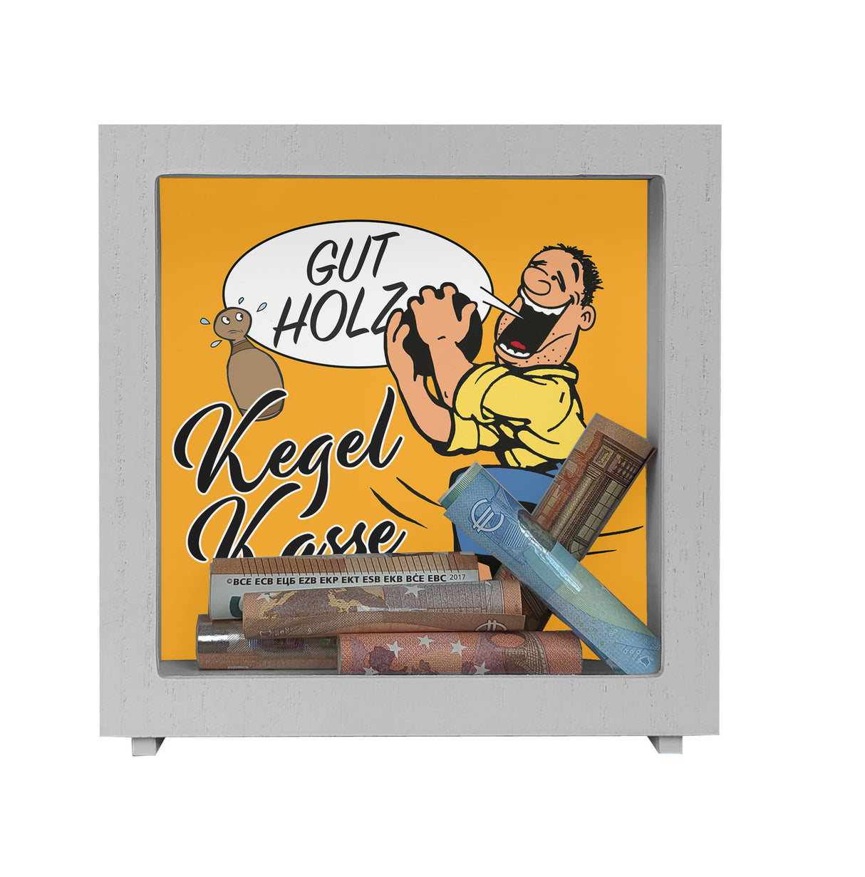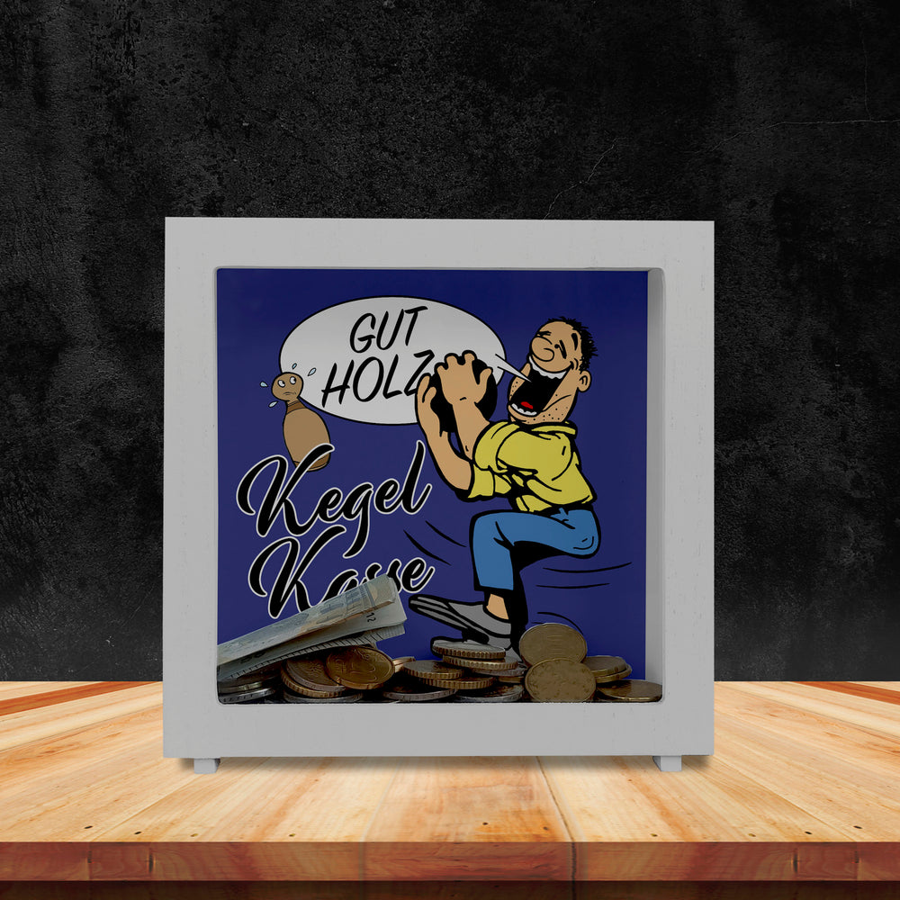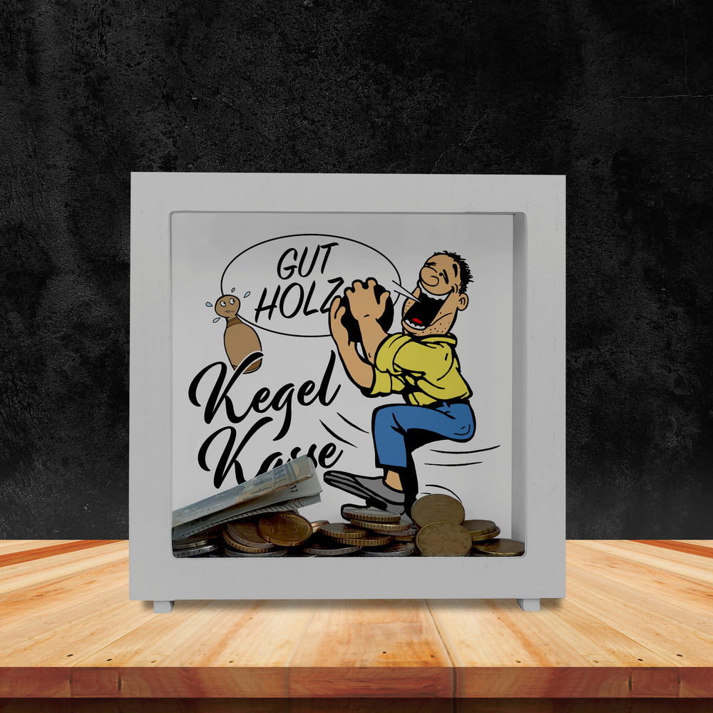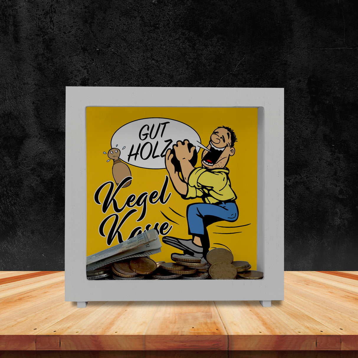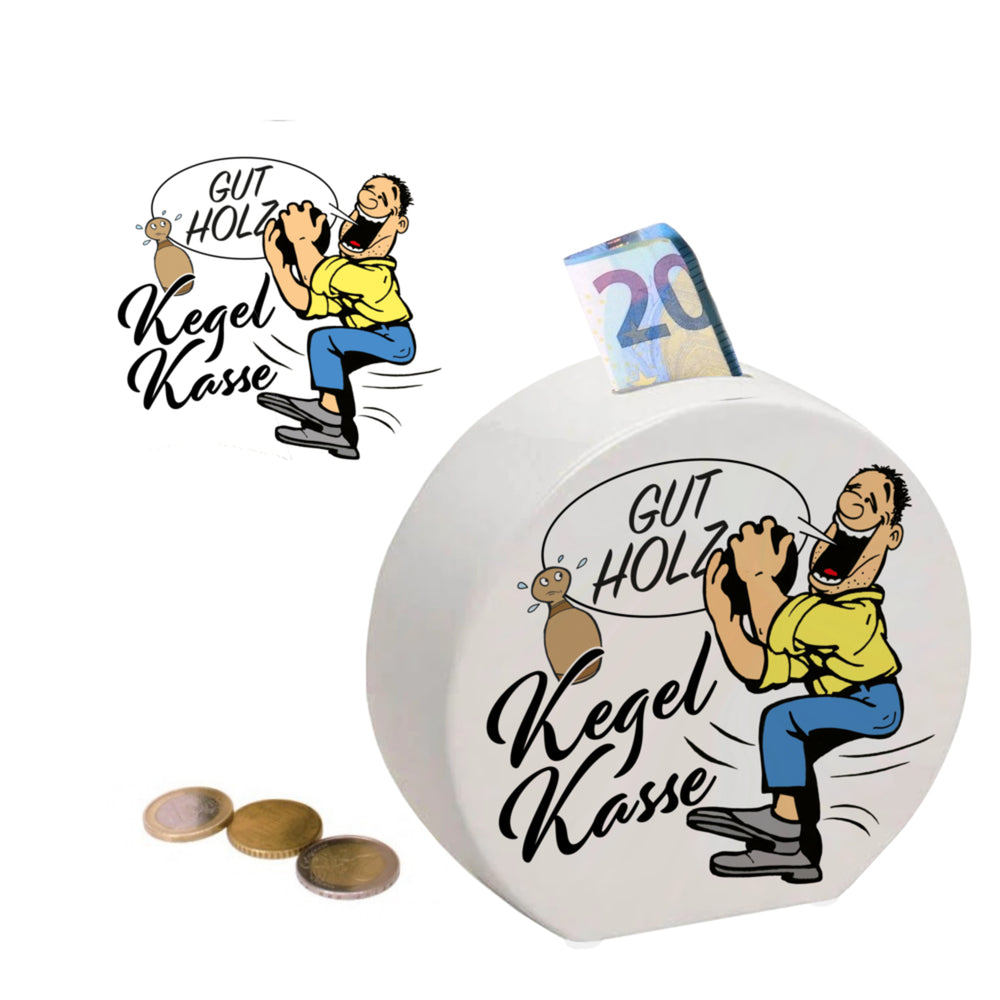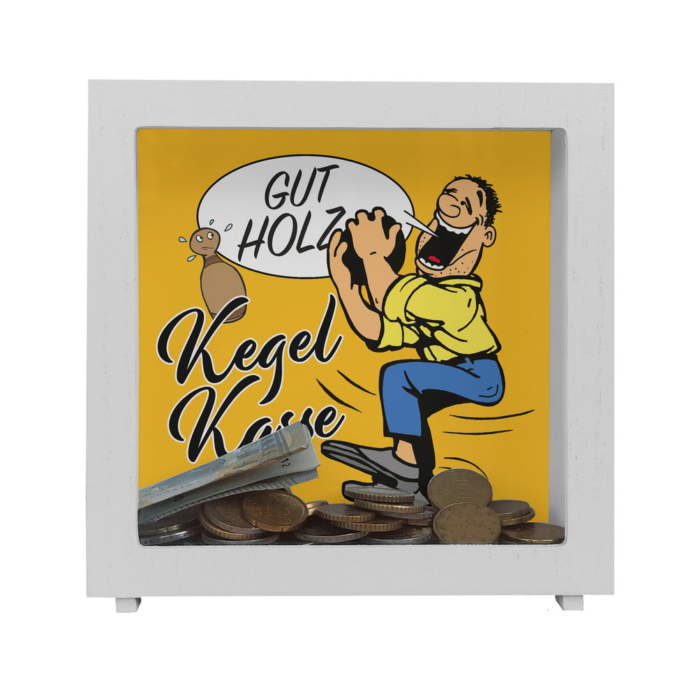 - 1x Kegelkasse Spardose Gut Holz mit lustigem Kegelspieler Motiv in der gewählten Ausführung