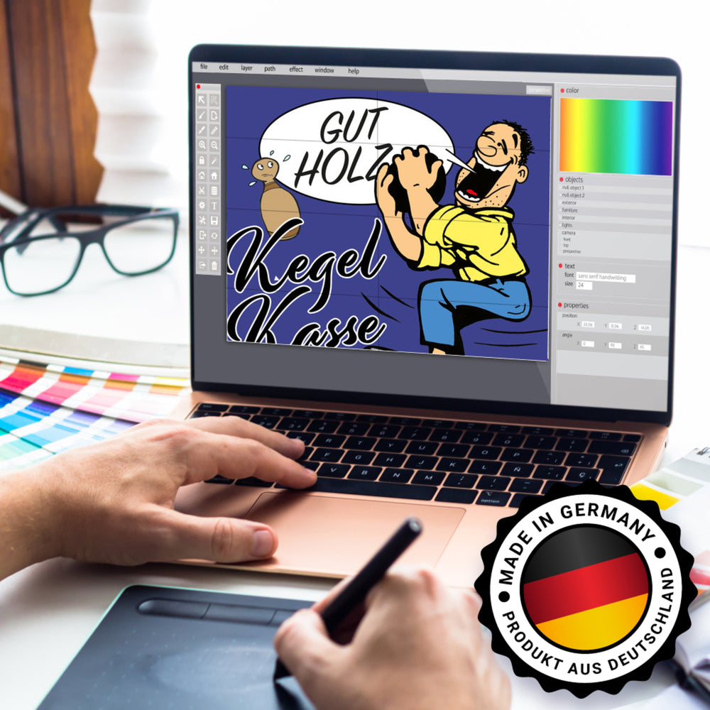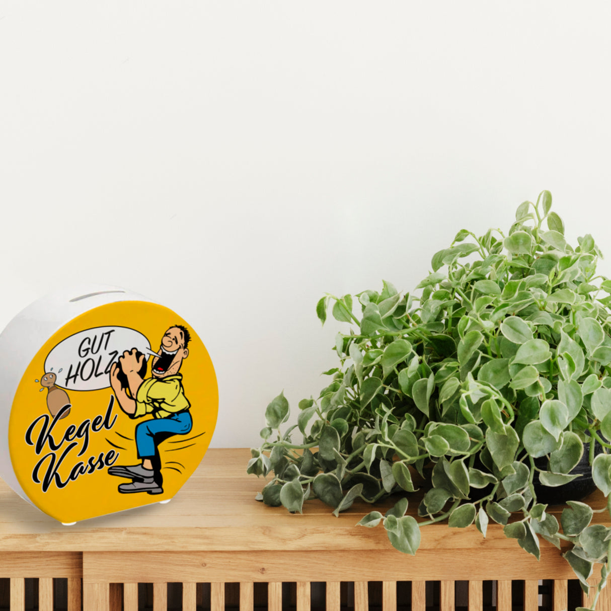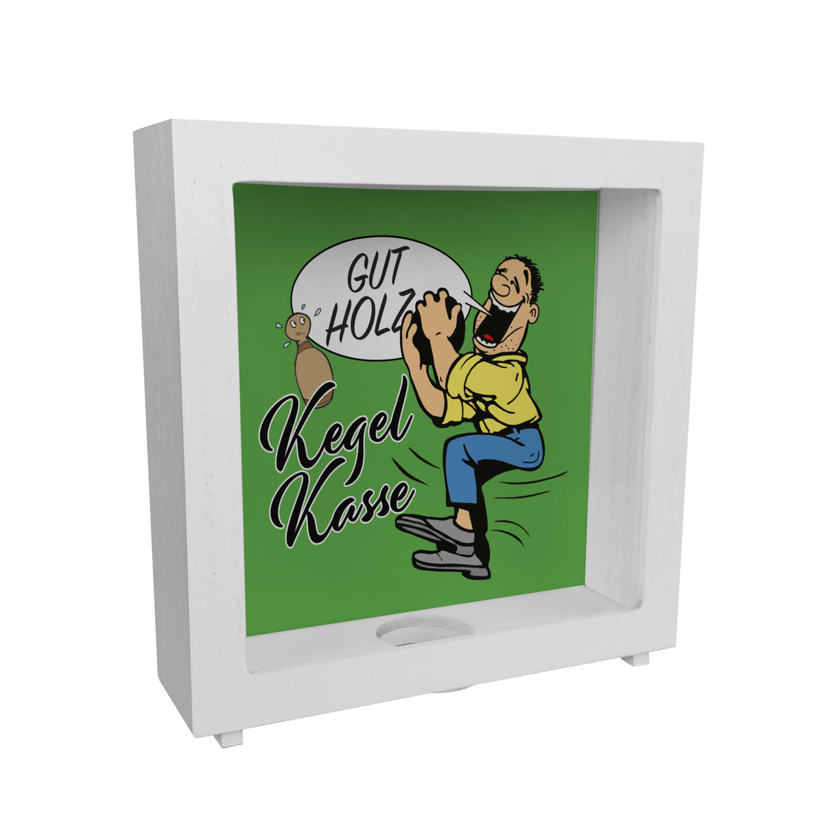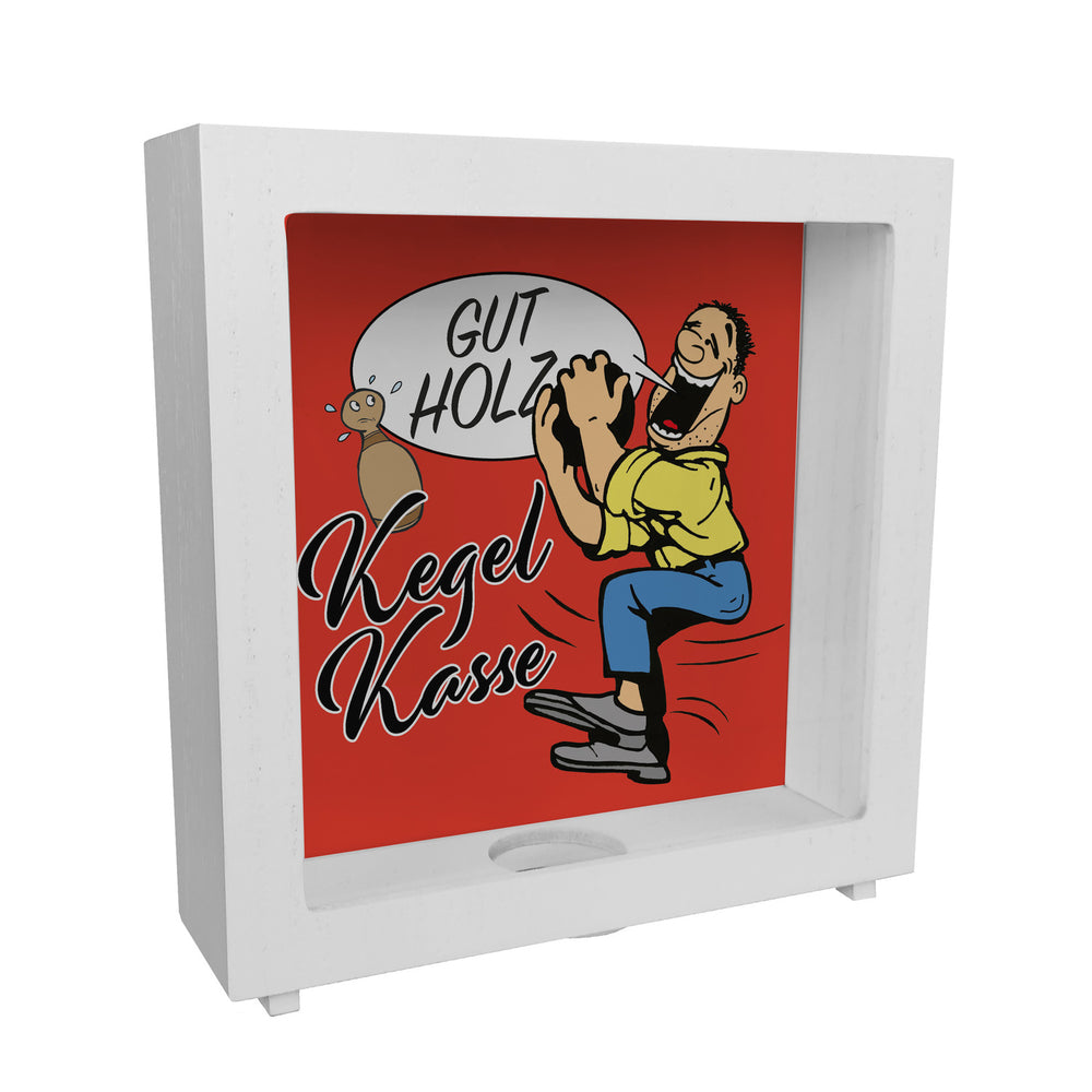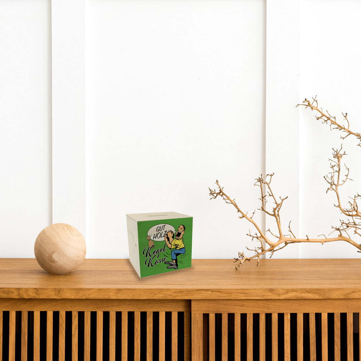 - 1x Kegelkasse Spardose Gut Holz mit lustigem Kegelspieler Motiv in der gewählten Ausführung