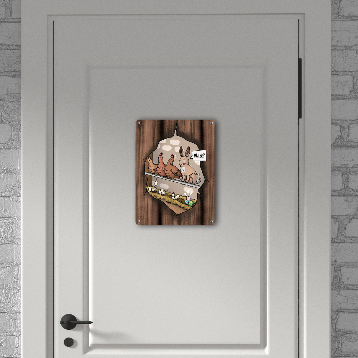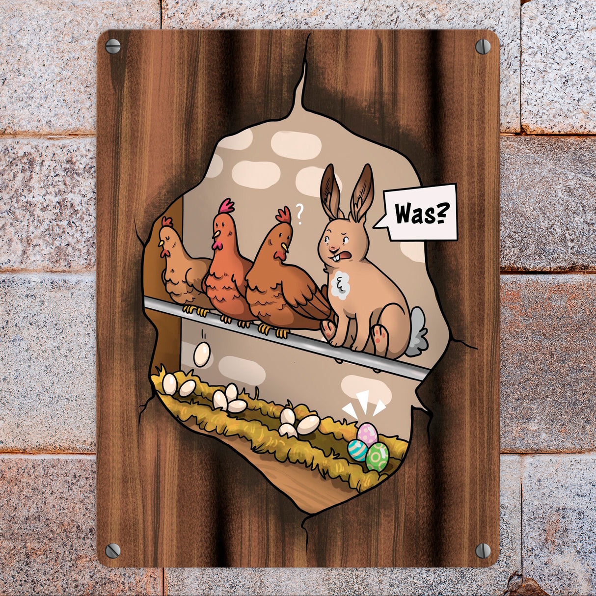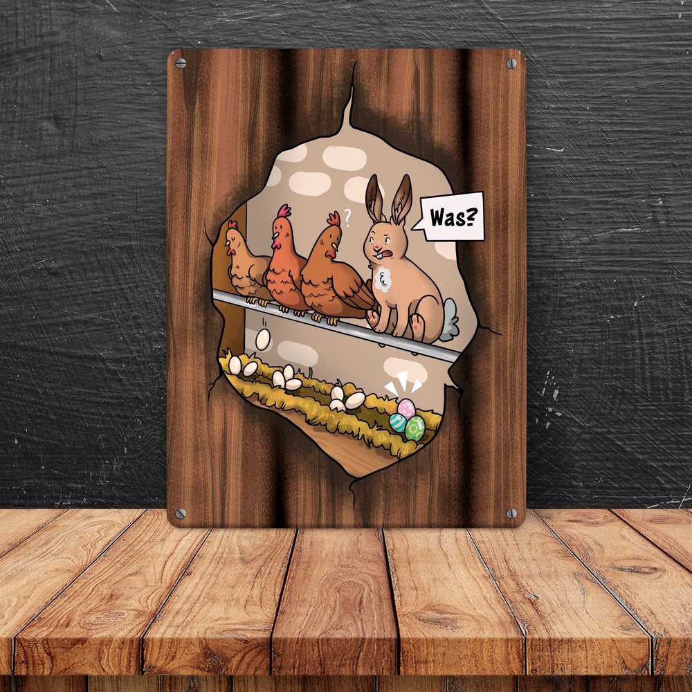 - 1x Ostern-Cartoon Metallschild mit Hühnerstall-Szene in der gewählten Größe