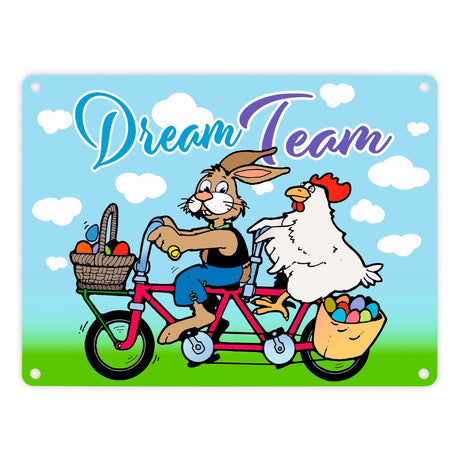 Osterhase und Huhn auf Tandem Metallschild zum Thema Ostern