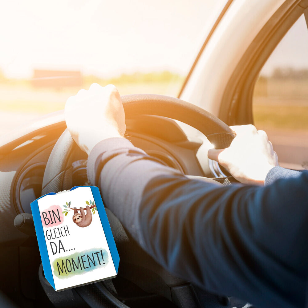 Ein geparktes Auto mit einem Augenzwinkern - klingt das nicht toll? Unsere Fröhliche Faultier Bin gleich da Parkscheibe ist genau das, was entspannte Autofahrer brauchen, um den Alltag mit einem Lächeln zu meistern! Diese hinreißende Parkscheibe zeigt ein fröhliches Faultier, sanft baumelnd an einem Ast, umrahmt von angenehmen Pastellfarben. Die Worte BIN GLEICH DA... MOMENT! in aquarellähnlicher Schrift setzen dem charmanten Design die Krone auf. Perfekt für alle, die beim Parken nicht auf Humor verzichten wollen!Mit ihrer robusten Bauweise aus stabilem Kunststoff, ergänzt durch einen praktischen Eiskratzer, eine Tropfenleiste aus weichem Gummi und zwei Einkaufswagenchips, ist sie der perfekte Begleiter für stressfreie Parkmanöver. Dank der Gültigkeit nach StVO sind Sie auch rechtlich auf der sicheren Seite. Doch diese Parkscheibe kann mehr als nur ordnungsgemäßes Parken: als witziges Deko-Element oder charmanter Reminder für die kleinen Pausen im Leben zaubert sie jedem Betrachter ein Lächeln aufs Gesicht.Machen Sie diese originelle Parkscheibe zum Highlight Ihres Autos oder verschenken Sie Entspannung pur! Ideal für Freunde, Familie oder Kollegen, die im hektischen Alltag die Ruhe eines gemütlichen Faultiers schätzen. Greifen Sie zu und verbreiten Sie Freude, Entspannung und ein Lächeln bei Ihrer nächsten Parkplatzsuche!