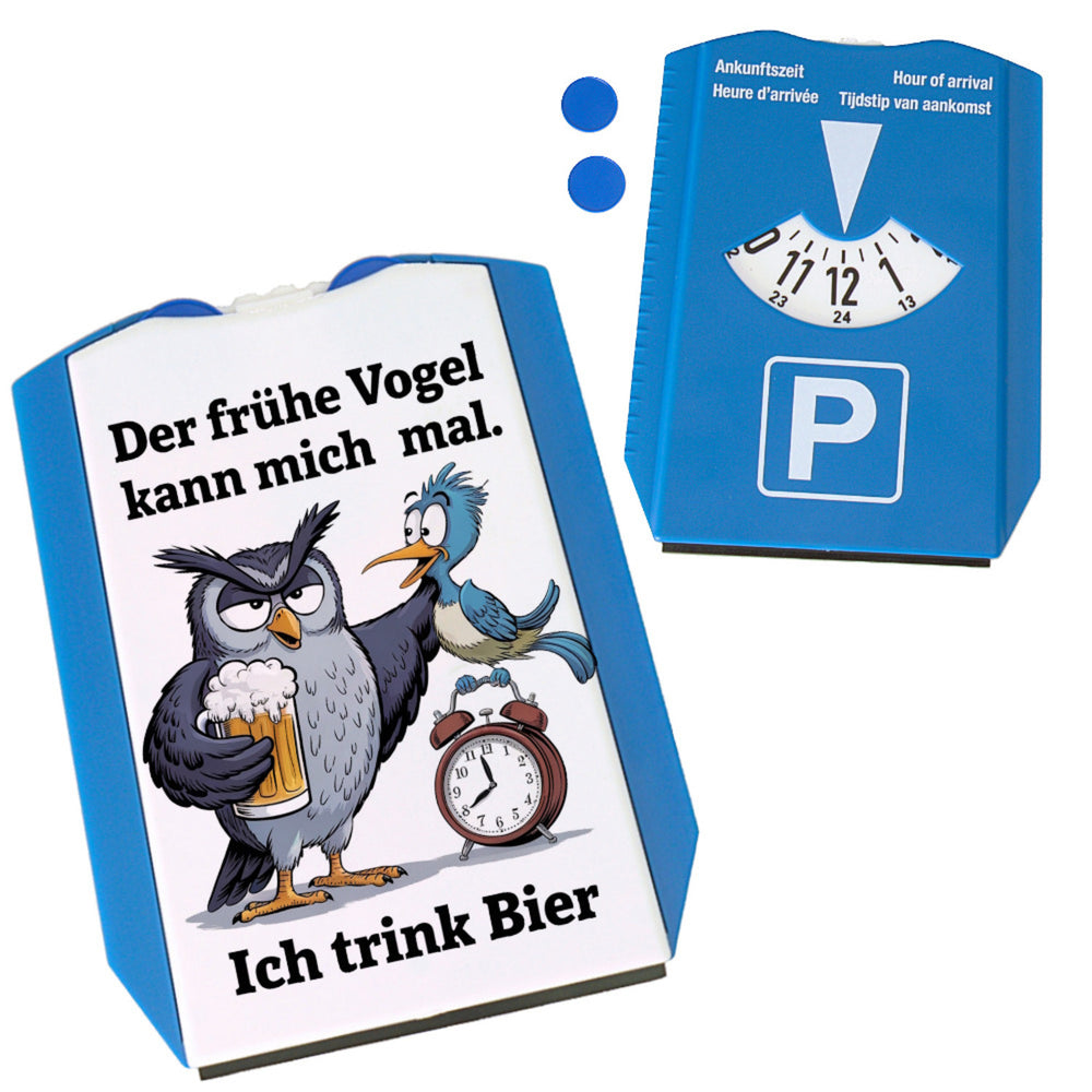 Diese Parkscheibe vereint Humor und Funktionalität: Eine graue, ernst dreinblickende Eule hält einen prall gefüllten Bierkrug und ignoriert den überraschten kleinen Vogel auf einem Wecker. Der groß geschriebene Spruch „Der frühe Vogel kann mich mal – ich Hinweise: Material: Kunststoff / gültig nach StVO / mit 2 Einkaufswagenchips / Größe: ca. 15x12 cm