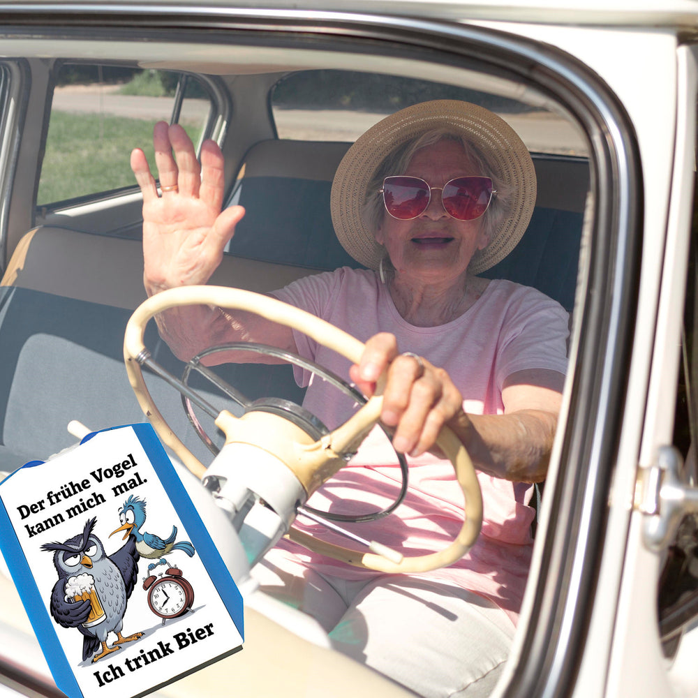 Bist du bereit, deinem Auto einen Schuss Humor zu verleihen? Dann begrüße unsere „Graue Eule mit Bierkrug – Der frühe Vogel kann mich mal“-Parkscheibe an Bord! Diese witzige Parkscheibe ist der perfekte Begleiter für alle Autofahrer, die den morgendlichen Start mit einem Lächeln auf den Lippen angehen möchten. Die Illustration einer biertrinkenden, nachtaktiven Eule, die den weckenden Vogel gekonnt ignoriert, sorgt garantiert für Lacher – egal ob bei Freunden, Familie oder Parkplatznachbarn.Die Parkscheibe aus robustem Kunststoff bietet nicht nur Humor, sondern auch Funktionalität. Die Ausstattung mit Eiskratzer und Tropfenleiste aus weichem Gummi macht sie zum praktischen Alltagshelfer. Zwei integrierte Einkaufswagenchips runden das Zubehör ab. Und das Beste: Die Rückseite überrascht mit einem lustigen Druck – perfekt für alle, die auch auf kleinen Details Wert legen.Dieses Accessoire ist nicht nur ein Hingucker, sondern auch konform mit der StVO, sodass Sie im Straßenverkehr auf der sicheren Seite sind. Ideal als Geschenk für Bierliebhaber, Hobby-Nachtschwärmer oder einfach alle, die Freude an humorvollen Details haben. Sorgen Sie für schmunzelnde Blicke und zeigen Sie Ihren Sinn für Humor. Die graue Eule sagt: Der frühe Vogel kann mich mal – jetzt wird’s lustig!