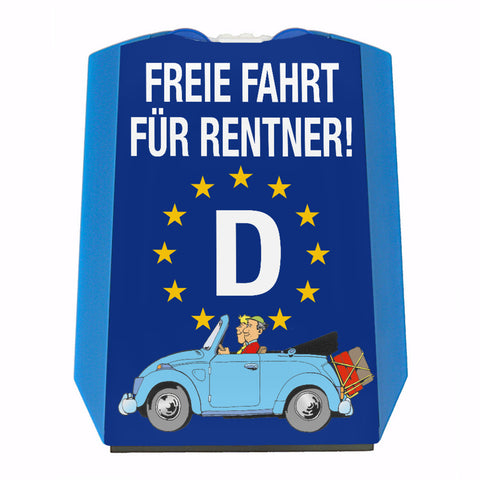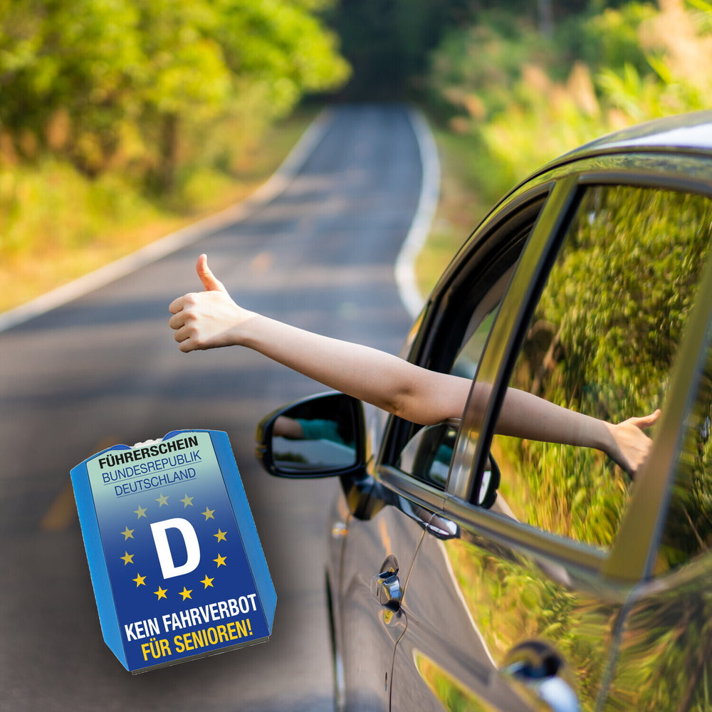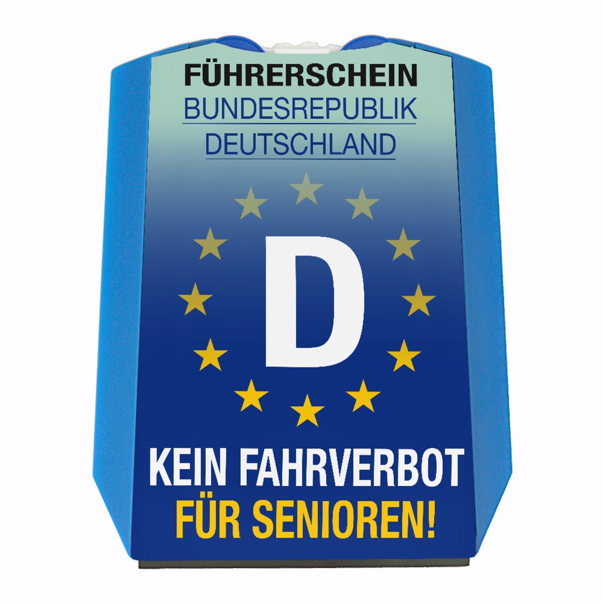 • Die Parkscheibe zeigt die folgenden Textelemente: Führerschein Bundesrepublik Deutschland. Darunter befindet sich ein großes D mit Sternen drumherum. Unter dem D steht: Kein Fahrverbot für Senioren! Der Hintergrund besteht aus einem türkis-blau Farbverlauf.