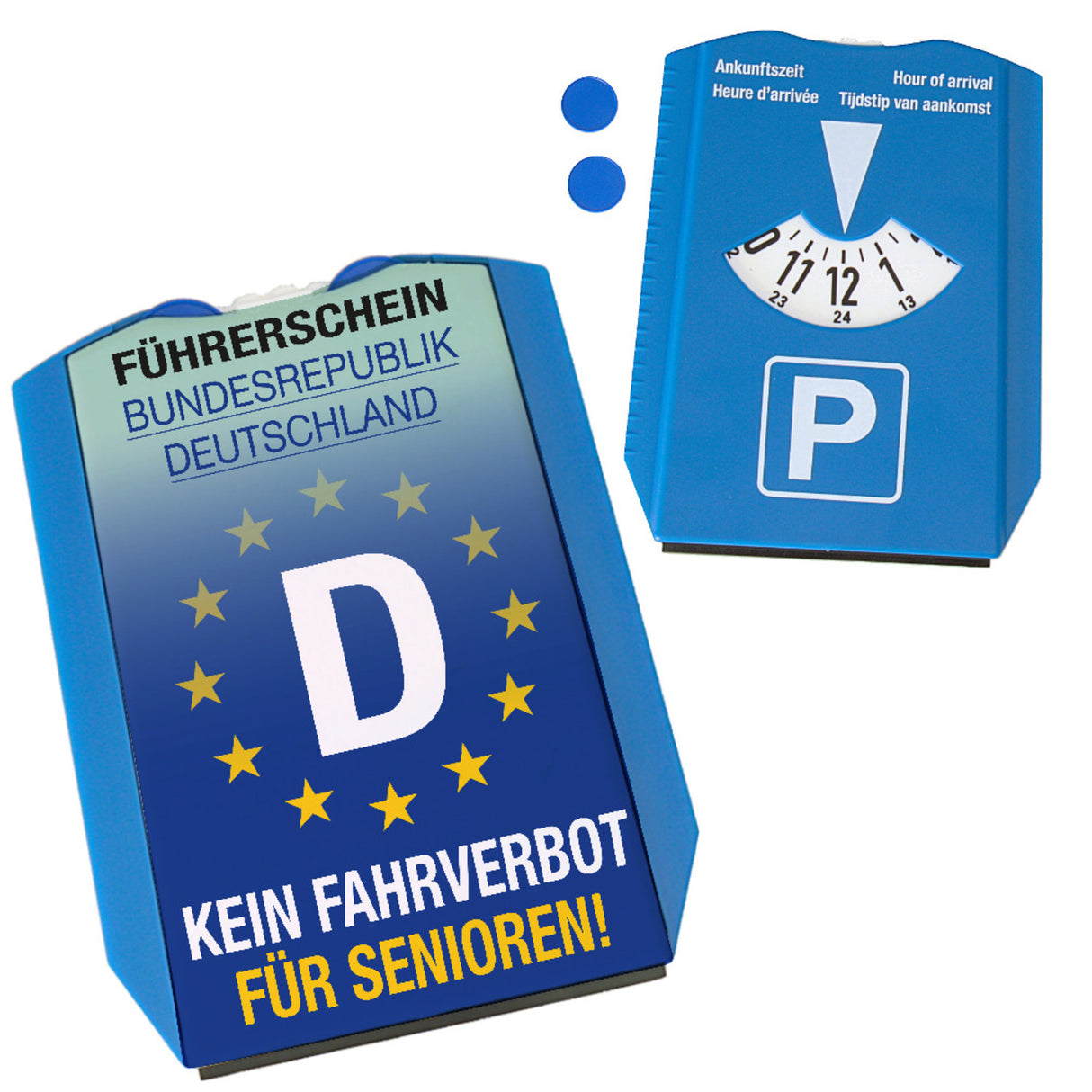 Kein Fahrverbot für Senioren Parkscheibe mit Eiskratzer und 2 Einkaufswagenchips