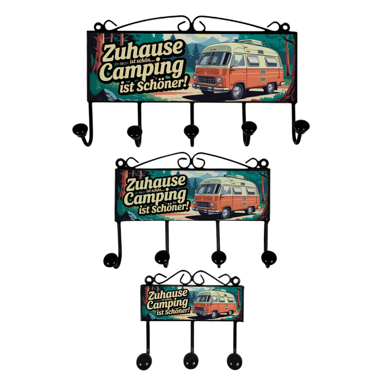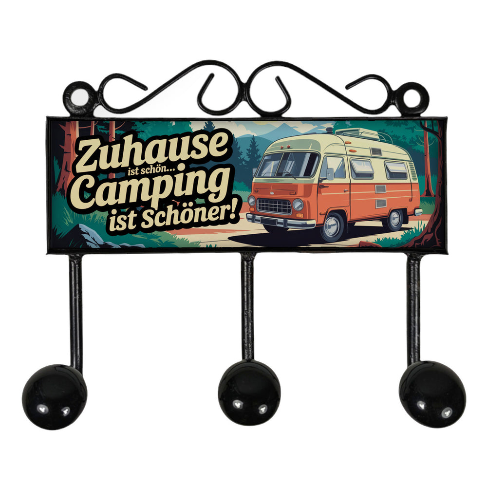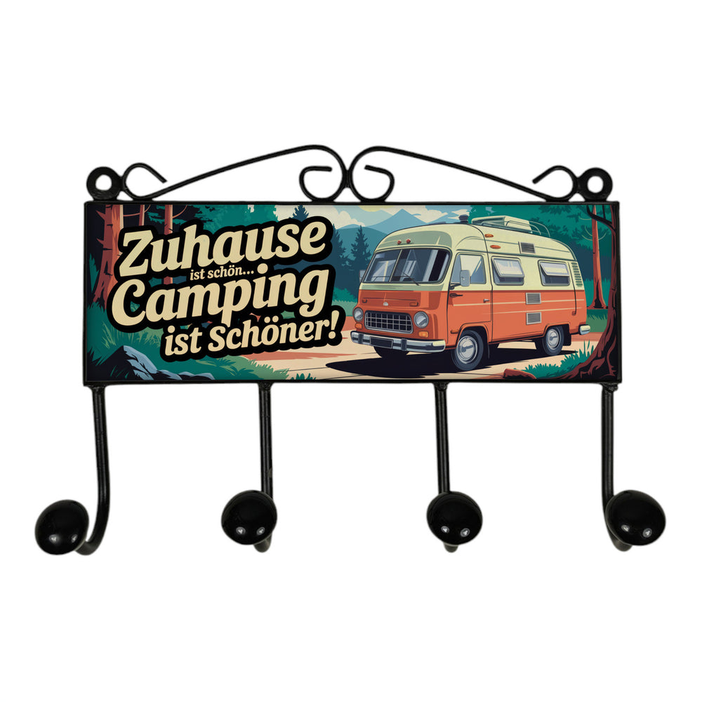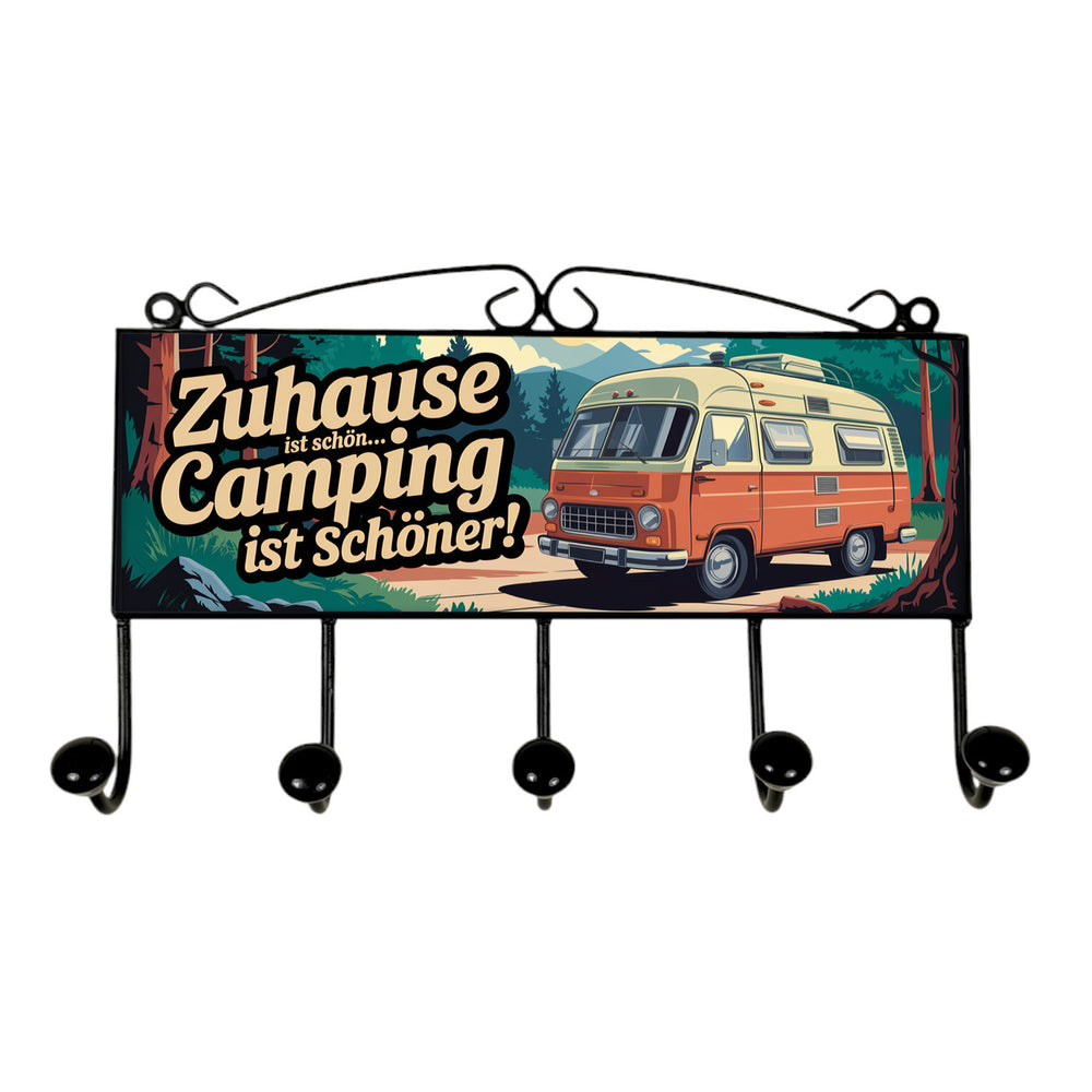 - Die Retro Wohnwagen Kleiderhaken Leiste besticht durch ein charmant nostalgisches Design. Die Vintage-Illustration eines Retro-Wohnwagens, eingerahmt von üppigem Wald und majestätischen Felsen, wird von dem lustigen Spruch "Zuhause ist schön... Camping ist schöner!" ergänzt. Die fette Retro-Schrift verleiht dem Ganzen den letzten Schliff.