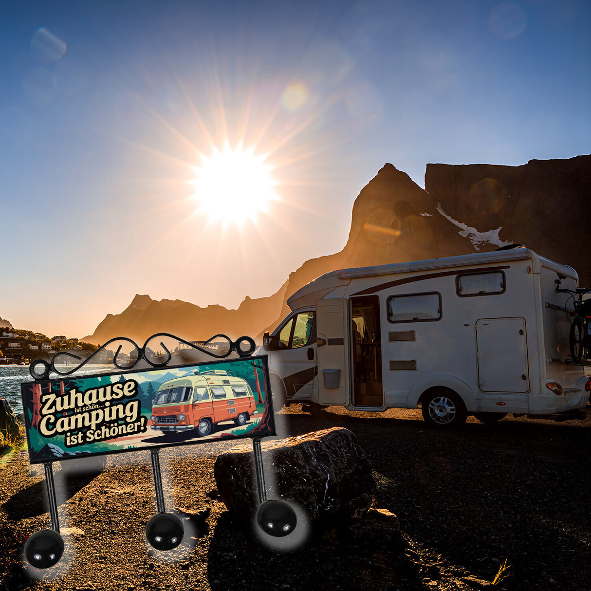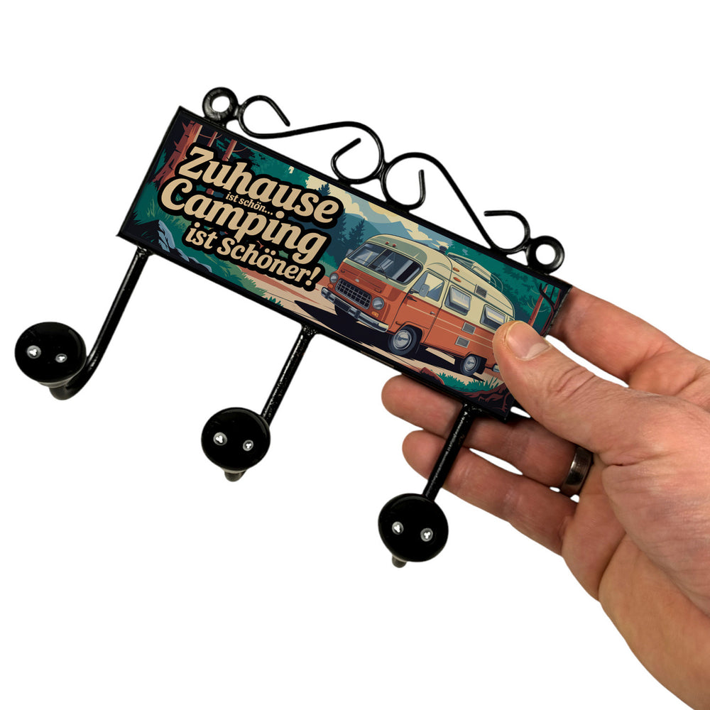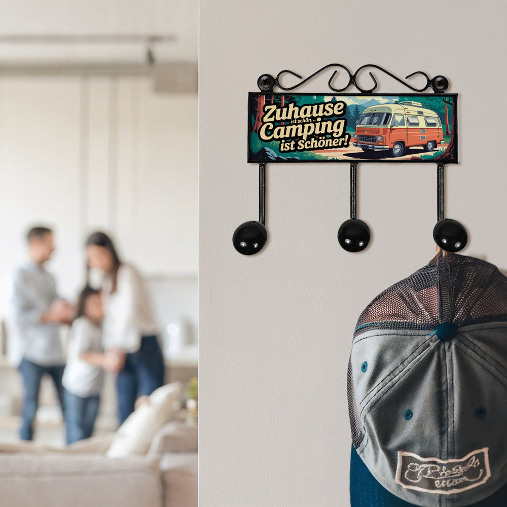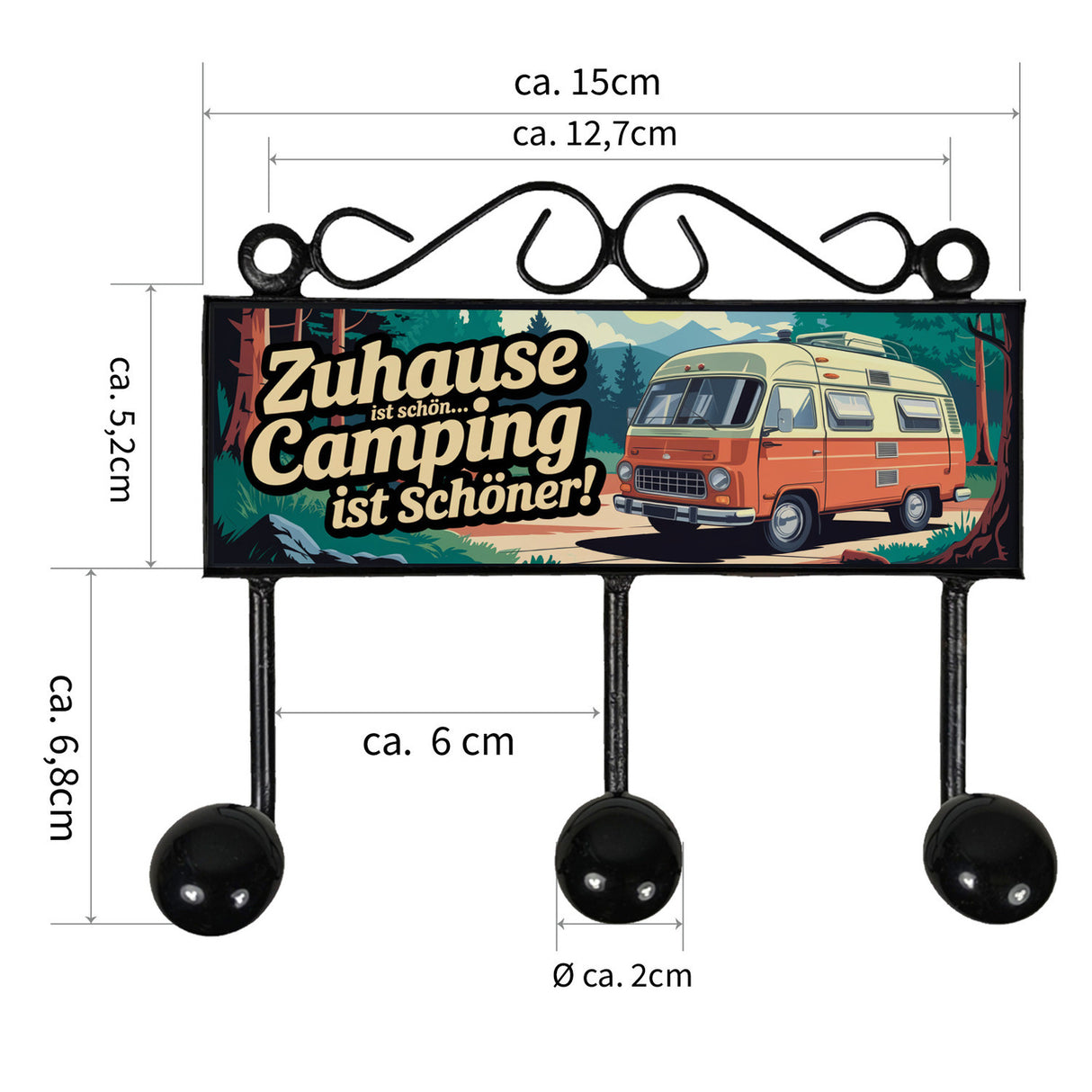 - Die Retro Wohnwagen Kleiderhaken Leiste besticht durch ein charmant nostalgisches Design. Die Vintage-Illustration eines Retro-Wohnwagens, eingerahmt von üppigem Wald und majestätischen Felsen, wird von dem lustigen Spruch "Zuhause ist schön... Camping ist schöner!" ergänzt. Die fette Retro-Schrift verleiht dem Ganzen den letzten Schliff.