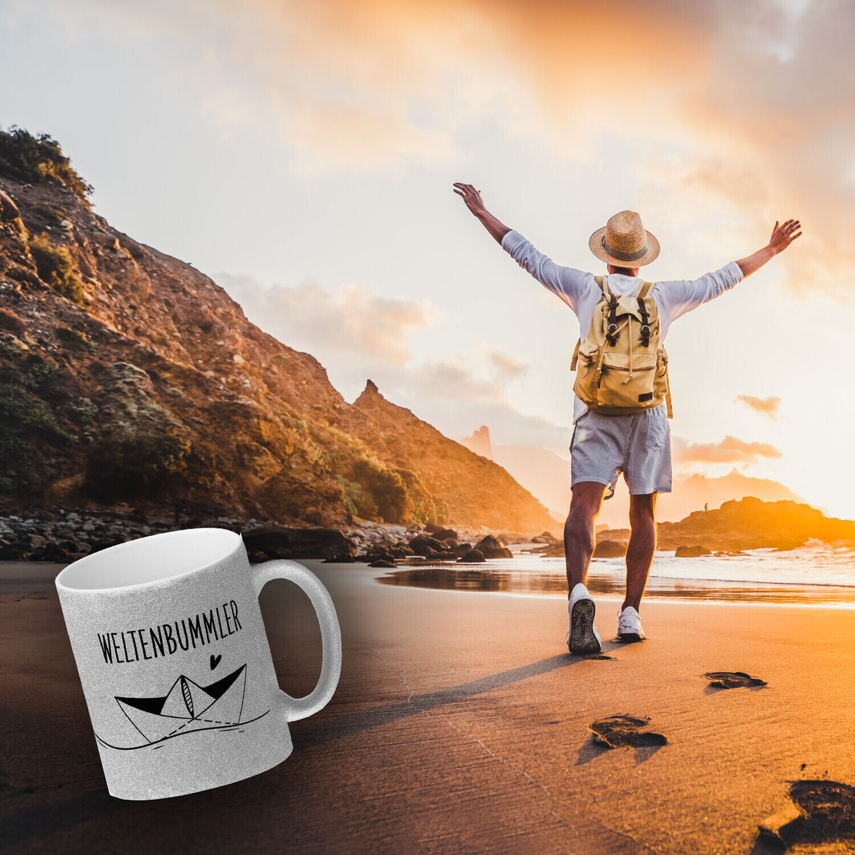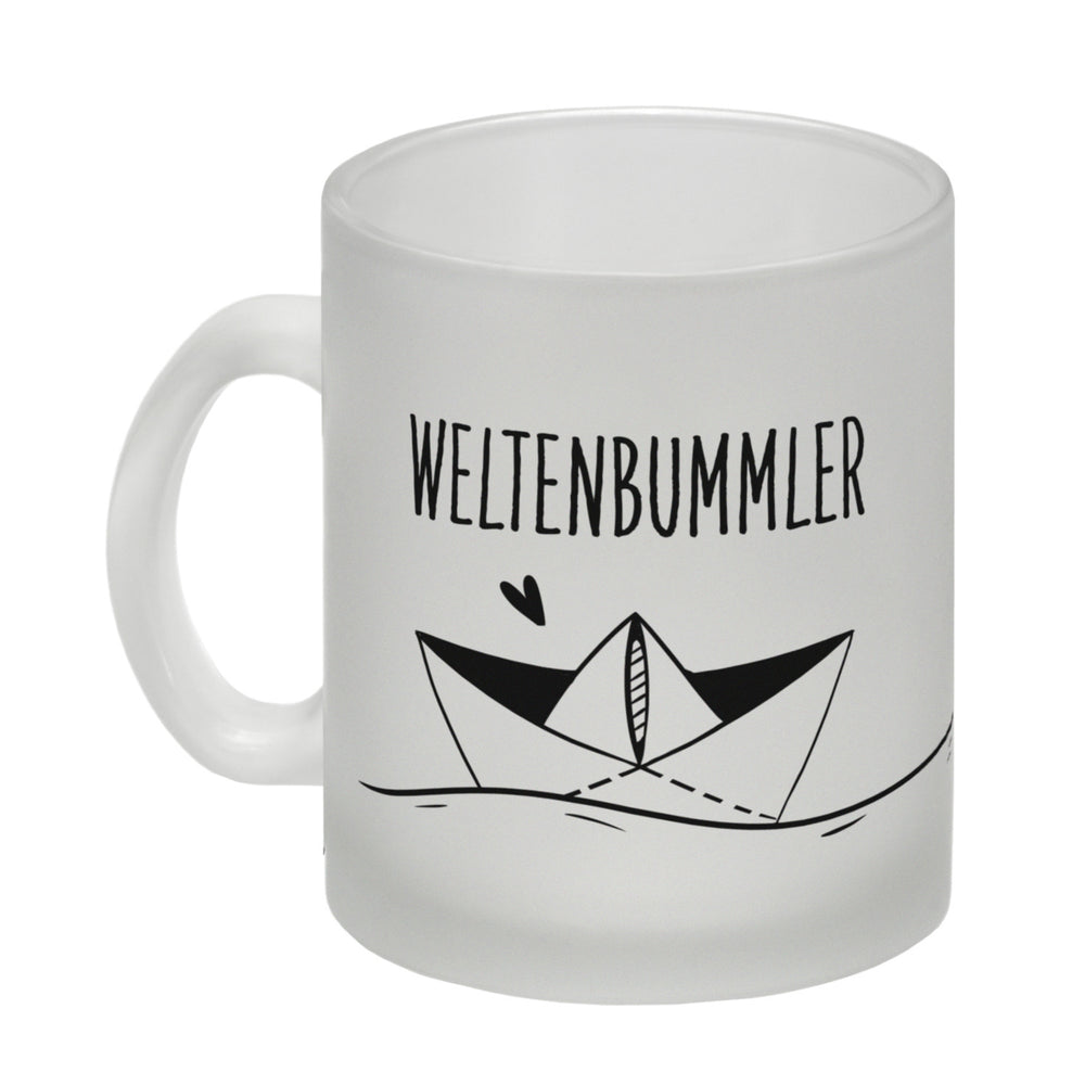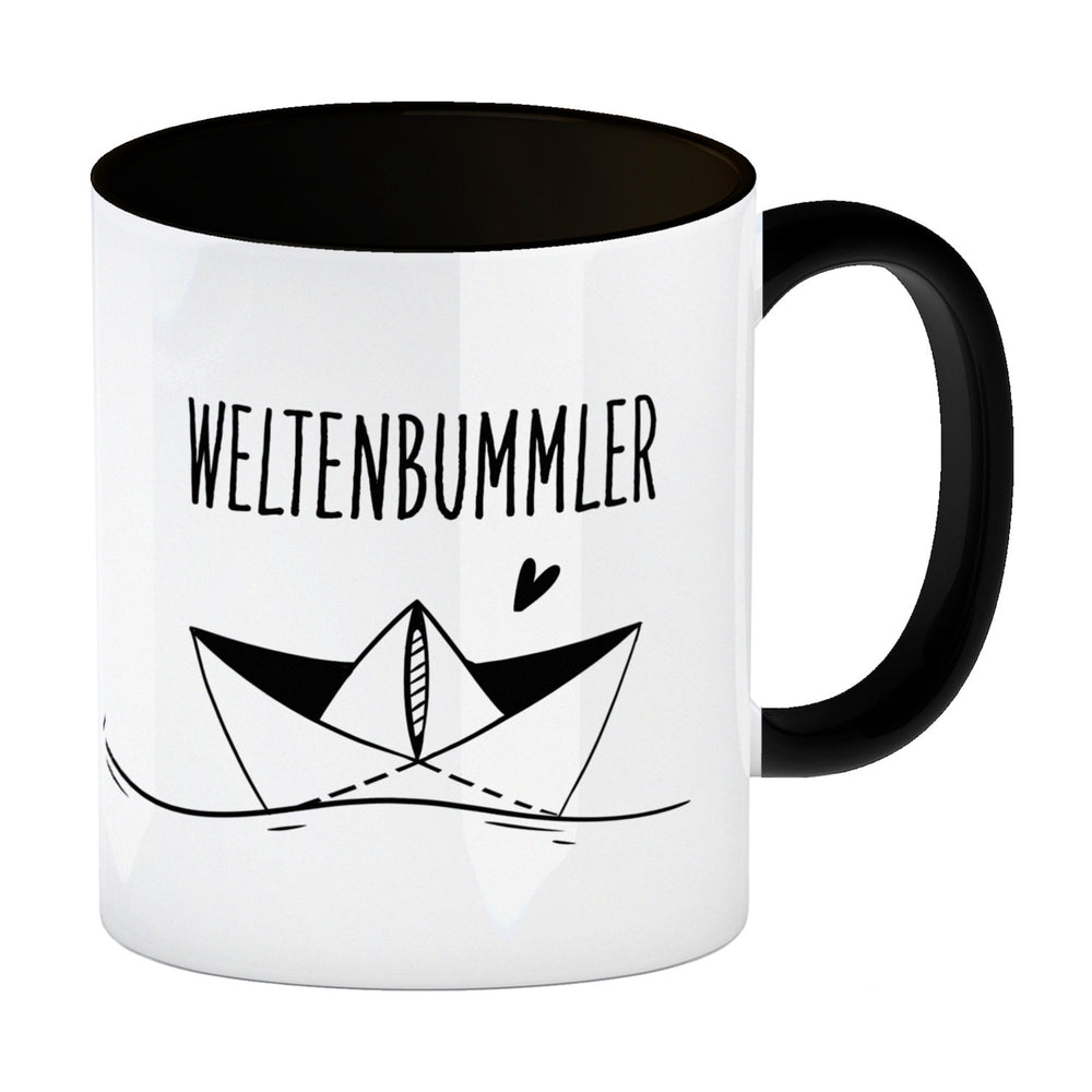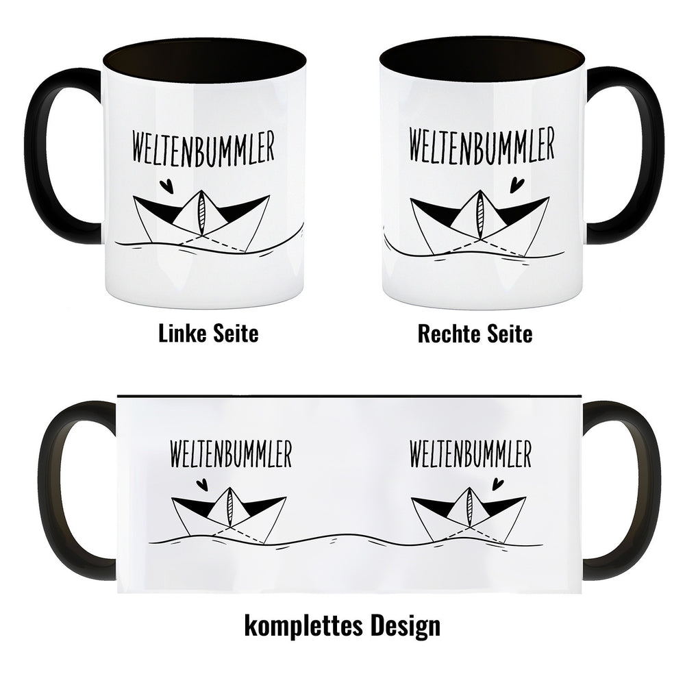 - 1x Weltenbummler Kaffeebecher mit schönem Papierschiff Motiv in der gewählten Ausführung
