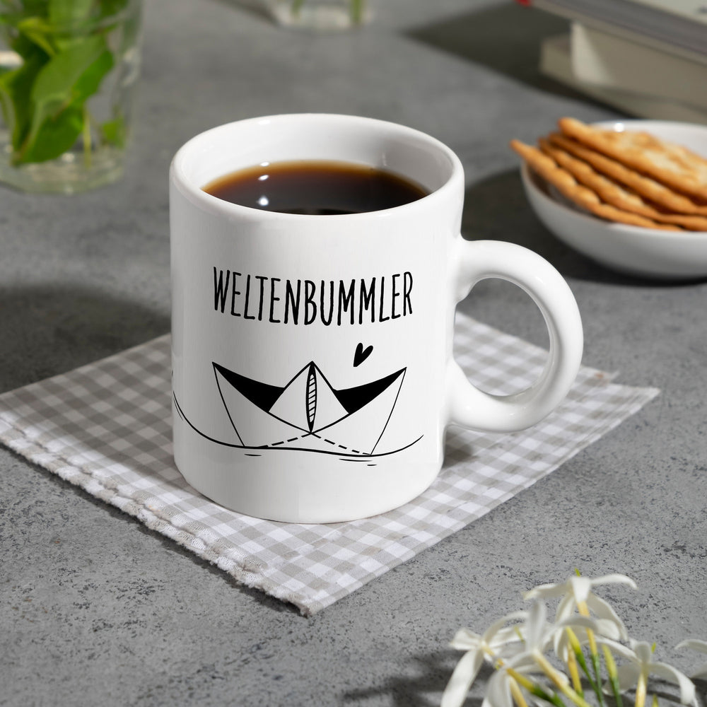 Weltenbummler Kaffeebecher mit schönem Papierschiff Motiv