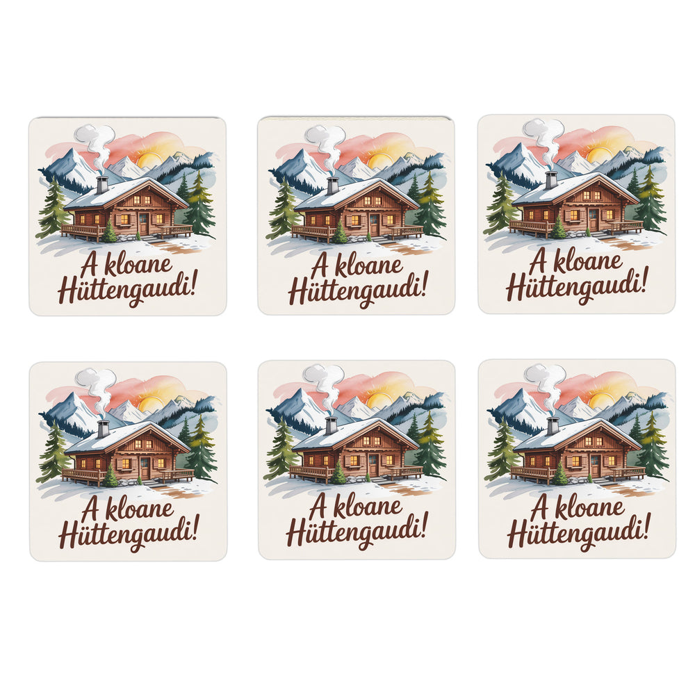 • Entdecken Sie unser einzigartiges 6er Set Untersetzer, das mit einem charmanten Motiv im Alpenstil begeistert. Ein malerisches Holzhaus mit rauchendem Schlot, umrahmt von einem atemberaubenden Bergblick, lädt im Aquarellstil zum Träumen ein. Der herzliche Spruch "A kloane Hüttengaudi!" rundet das Design perfekt ab.
