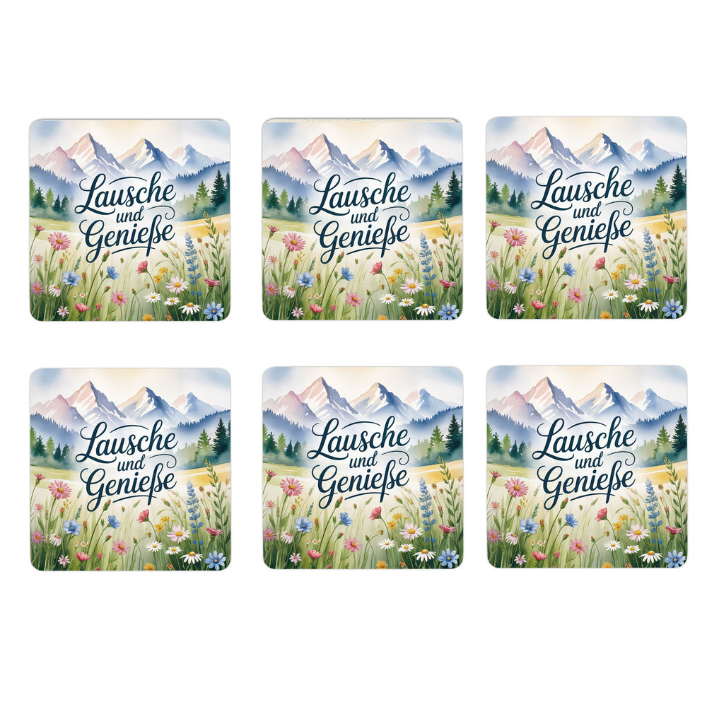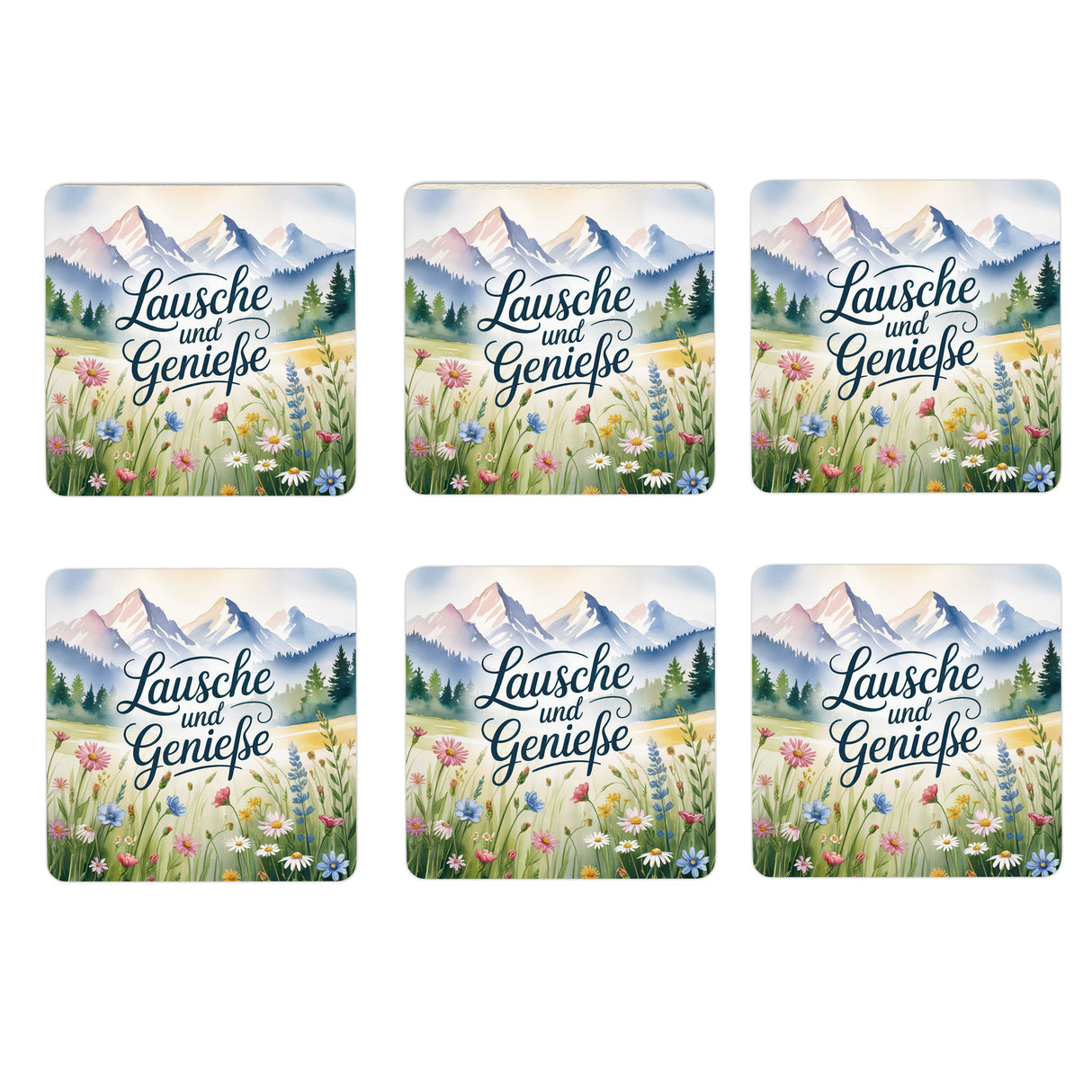 Die Allgäu Bergwiese Untersetzer im 6er Set zeigen ein wunderschönes Aquarellgemälde. Die bayerischen Alpen erscheinen als zarte Silhouette im Hintergrund, während im Vordergrund lebhafte Wildblumen erblühen. Der Spruch "Lausche und genieße" in ka Hinweise: Material: Holz / quadratisch / ca. 9,5 x 9,5 cm
