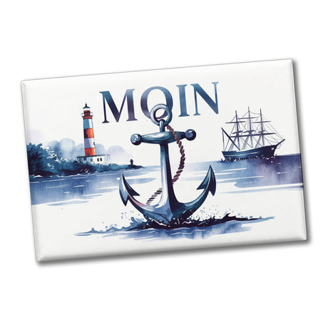 Unser maritimer Kühlschrankmagnet zeigt eine bezaubernde Aquarellillustration der Nordsee. Ein majestätischer Anker thront im Vordergrund, während ein Leuchtturm und ein Schiff den Hintergrund schmücken. Der fette, humorvolle Schriftzug "MOIN" run Hinweise: Größe: ca. 8x5,5 cm