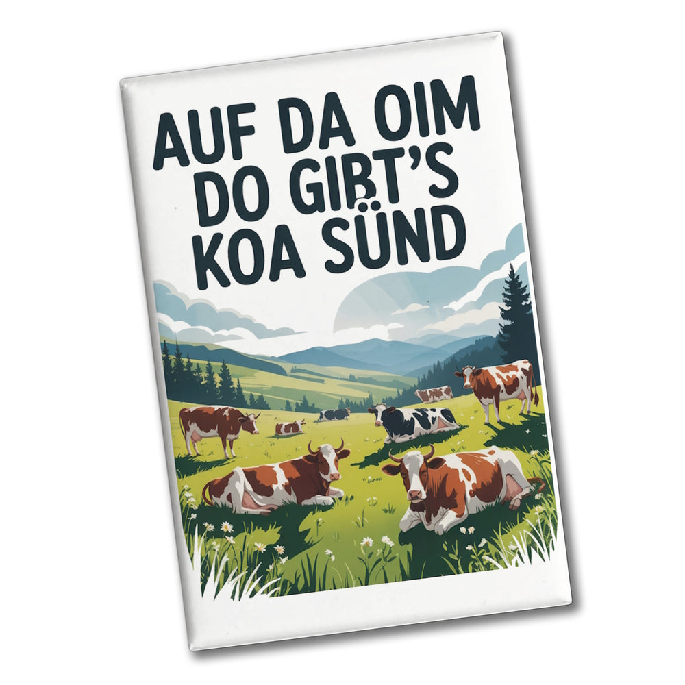 - Dieser Kühlschrankmagnet zaubert jedem Bergliebhaber ein Lächeln ins Gesicht! Mit einem charmanten Design zeigt er eine idyllische Berglandschaft mit glücklichen Kühen und dem humorvollen Spruch "Auf da Oim, do gibt's koa Sünd". Die grünen Hügel, der blaue Himmel und die niedlichen Kühe machen ihn zu einem echten Hingucker.
