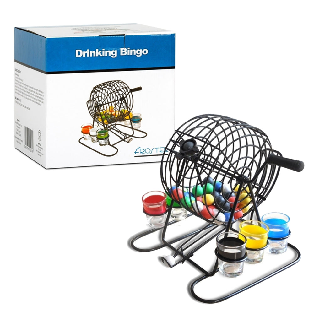 - Lieferumfang: 1x Bingo Trinkspiel bestehend aus 1x Bälletrommel, 6x Schnapsgläser und 48x Kugeln.