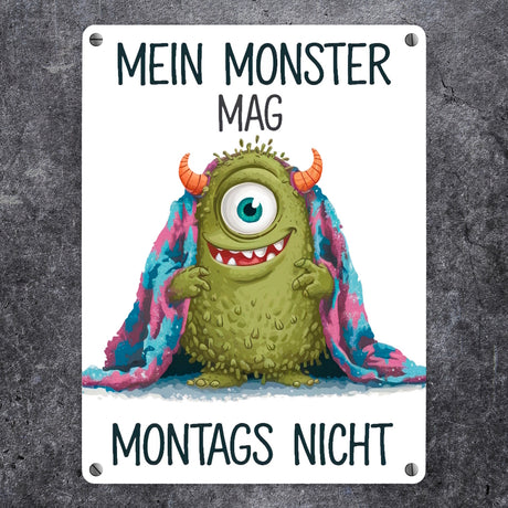 Grünes Monster mit Decke Montagsmuffel Metallschild in 15x20 cm